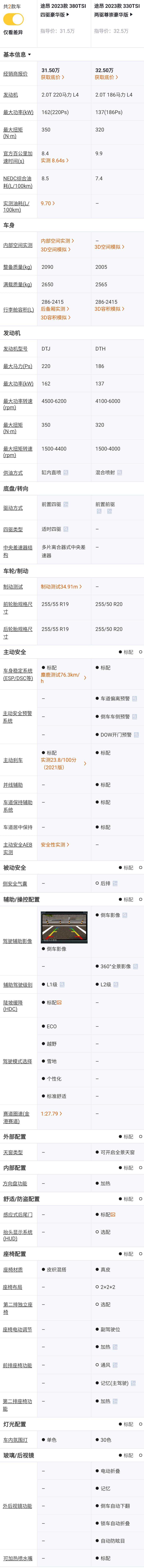 380TSI四驱豪华版对比330TSI两驱豪华版,价格+2万元,发动机喷油方式由混合喷射改为缸内直喷,发动机都是2.0T但功率升级,最大功率从137kW提高162kW,最大马力从186Ps提高到220Ps,动力表现更好,前置前驱升级为适时四驱,多了陡坡缓降功能,驾驶模式可选ECO、越野、雪地等模式。可以看到,这2万元主要花在动力升级上面,建议升级。
