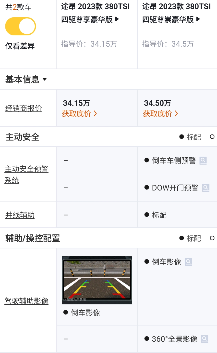 380TSI四驱尊崇豪华版对比380TSI四驱尊享豪华版,价格+0.35万元,多了变道辅助系统(带RCTA驶出车位辅助系统),倒车影像升级为360°全景影像,其他配置不变。个人觉得这0.35万元花的超值,建议升级。