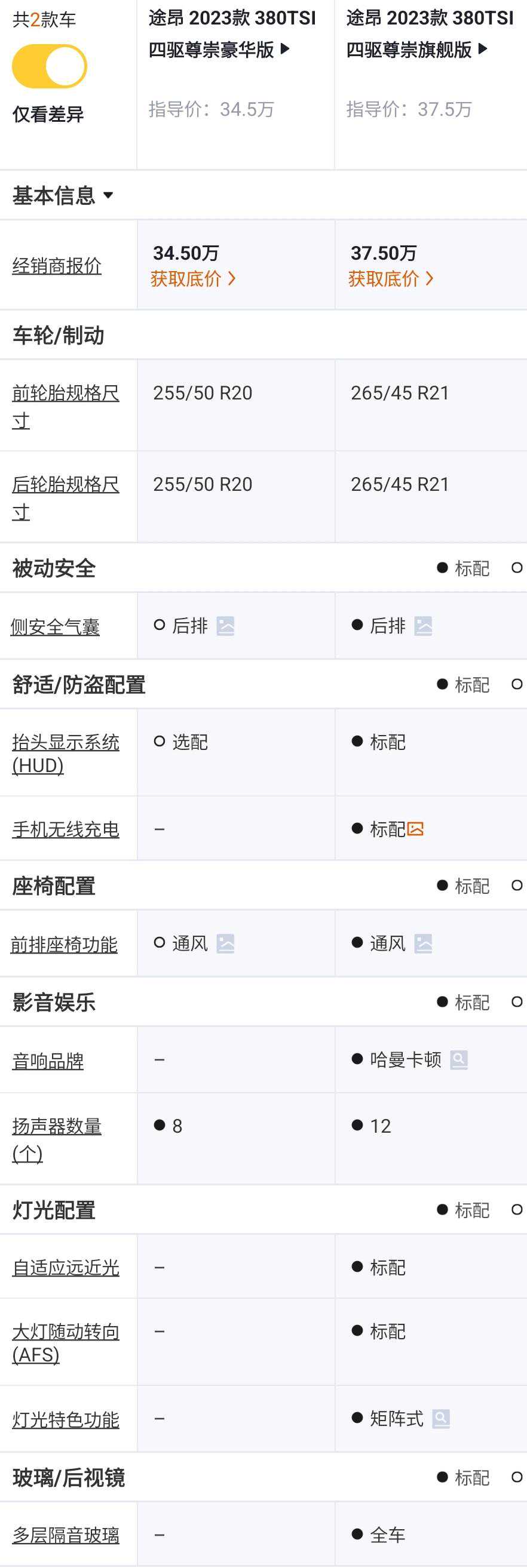 380TSI四驱尊崇旗舰版对比380TSI四驱尊崇豪华版,价格+3万元,轮胎从255/50R20升级为265/45R21,后排多了2个侧安全气囊,多了预碰撞安全系统、多了IQ.智能导视(HUD)功能,车内多了手机无线充电功能,前排座椅多了座椅通风功能,带8个扬声器的普通音响升级为带12个扬声器的哈曼卡顿音响,普通LED大灯升级为灵眸矩阵大灯(全LED矩阵式前大灯,含AFS随动转向、DLA智能远光灯会车/跟车调节),四门车窗配备了VSG双层隔音玻璃。个人觉得升级的这些配置价值其实超过3万元,建议升级。
