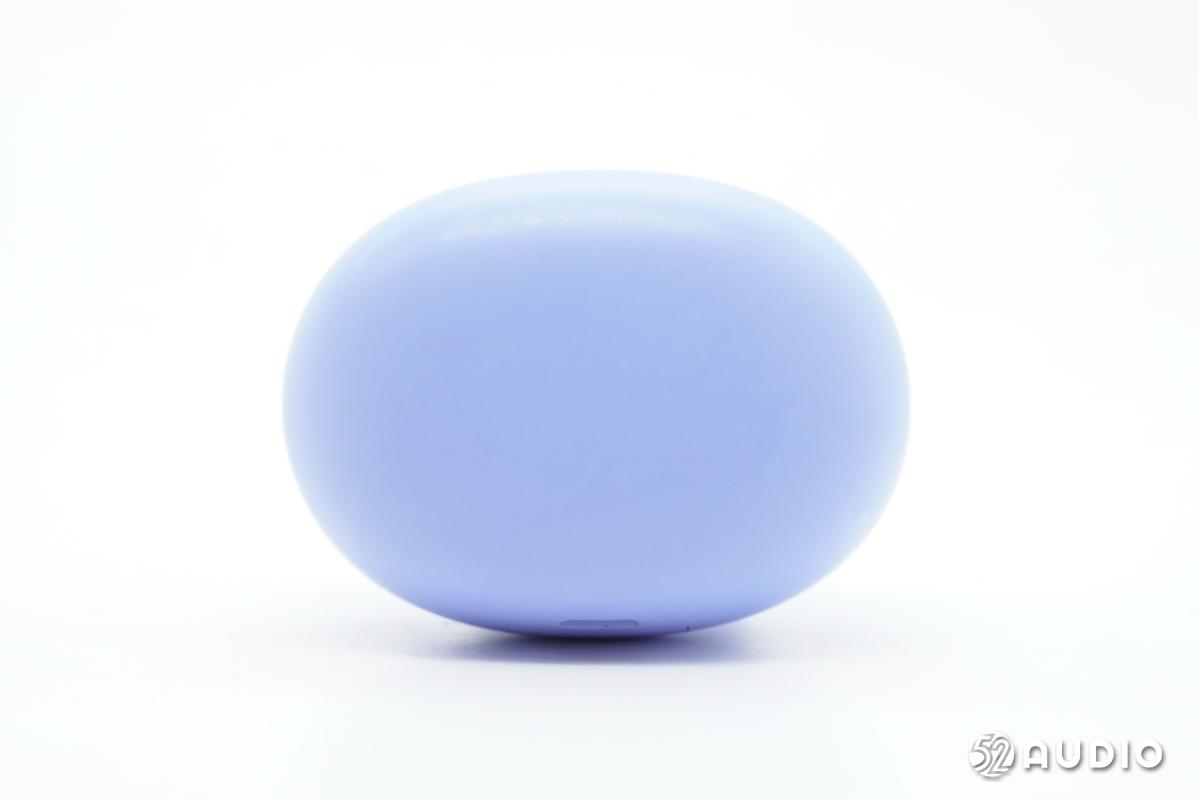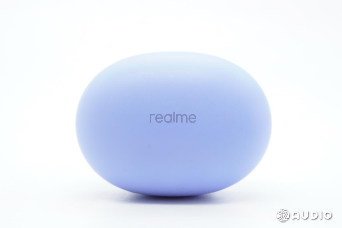 我爱音频网此次拿到的realmeBudsQ2真无线耳机充电盒为淡蓝色款式,充电盒外观为鹅卵石状的椭圆形状,兼顾颜值及便携,在盒盖上还印有“realme”的品牌名。