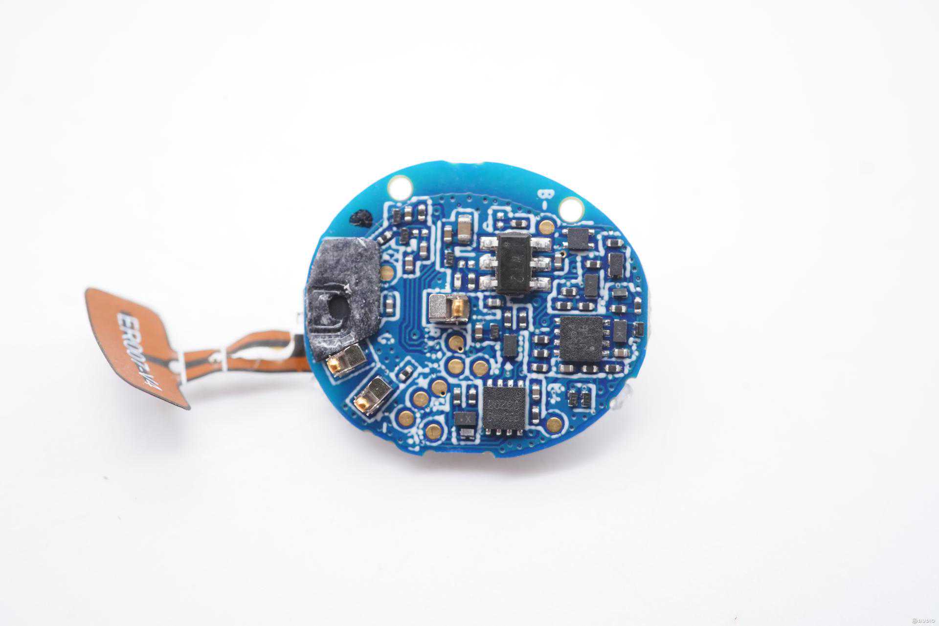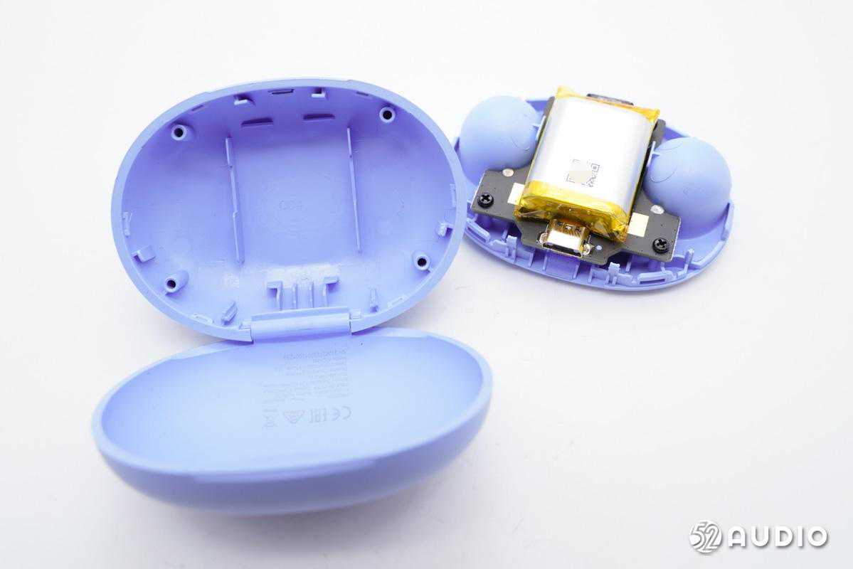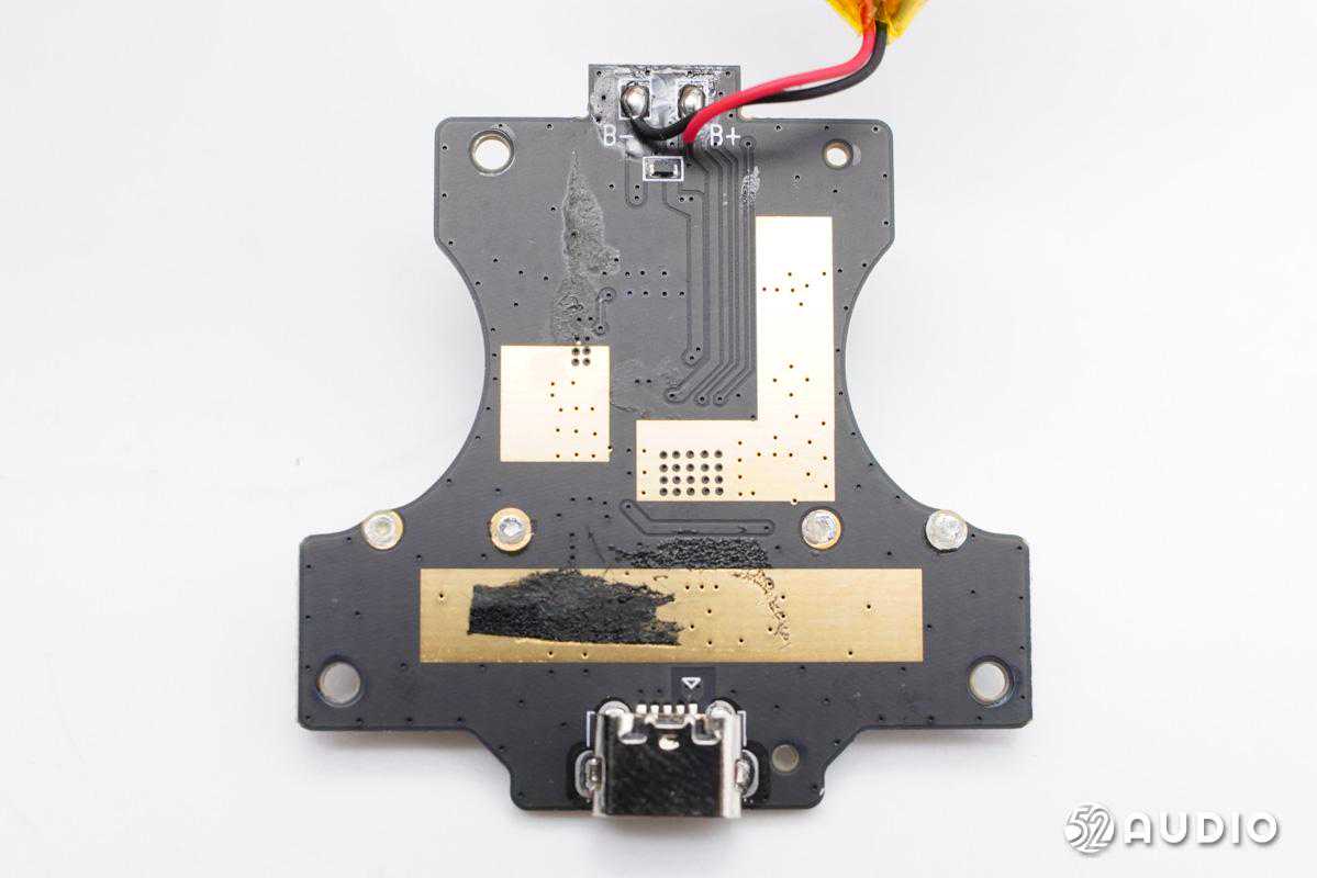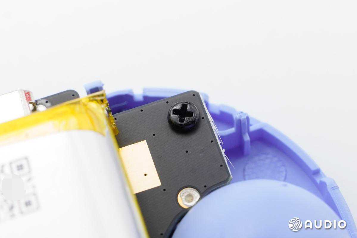 充电盒主板背面贴有电池,主板通过螺丝固定在耳机座舱背面。