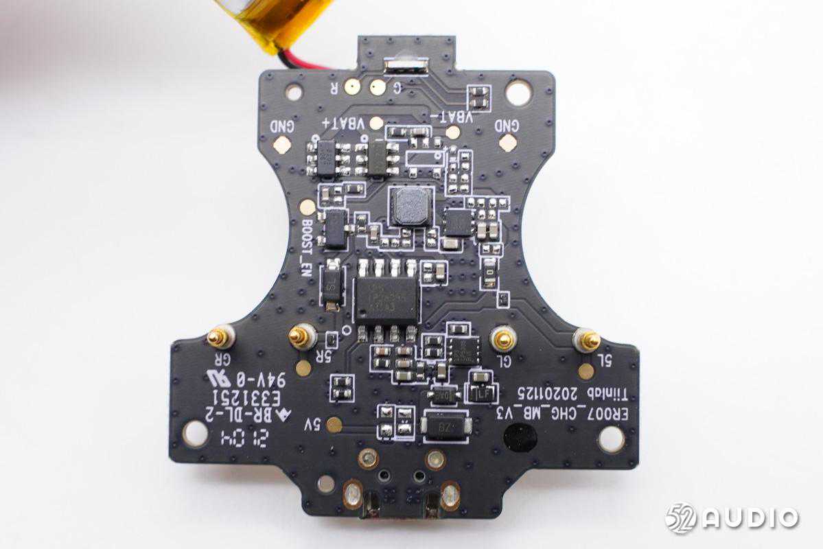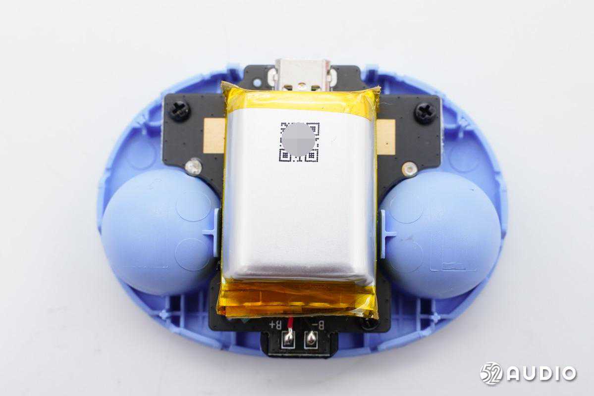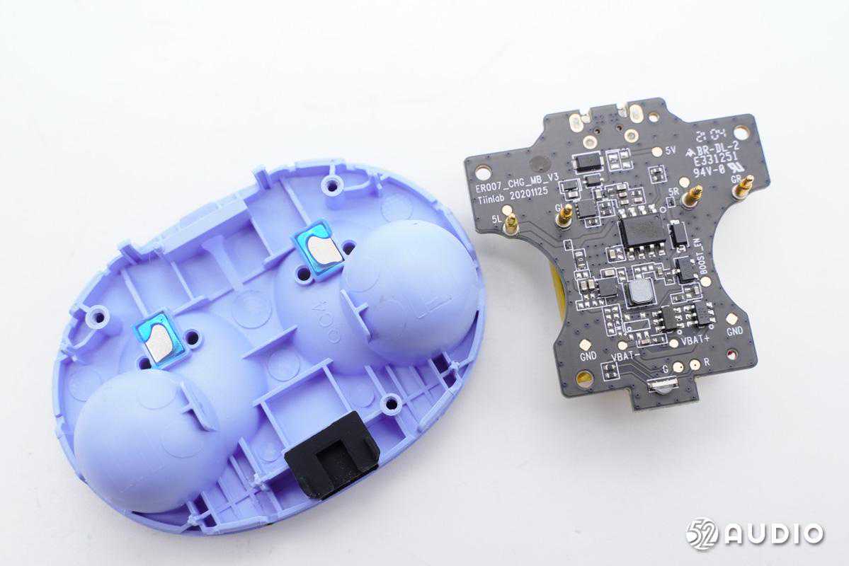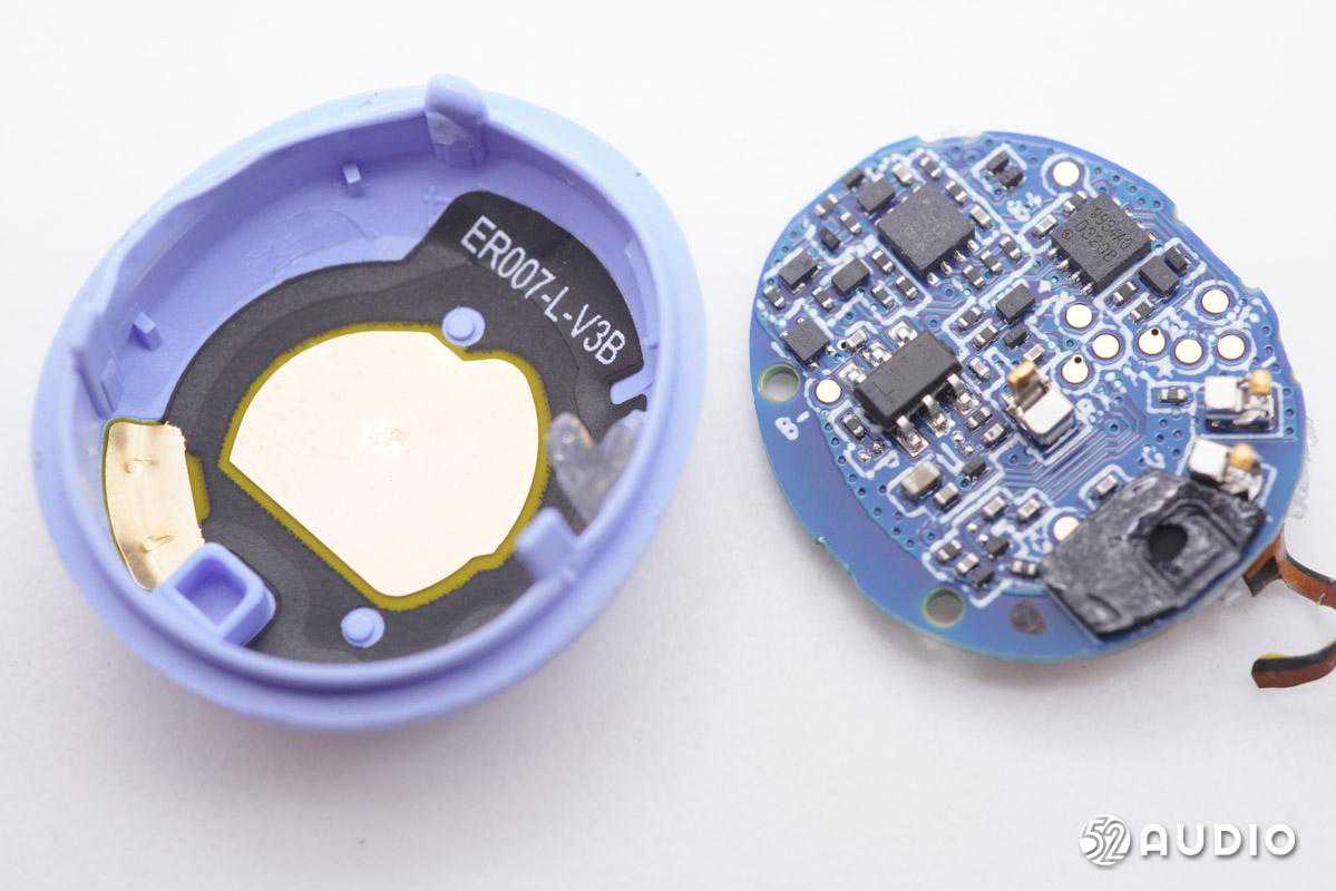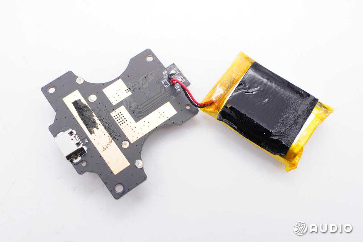 充电盒主板背面贴有电池,主板通过螺丝固定在耳机座舱背面。