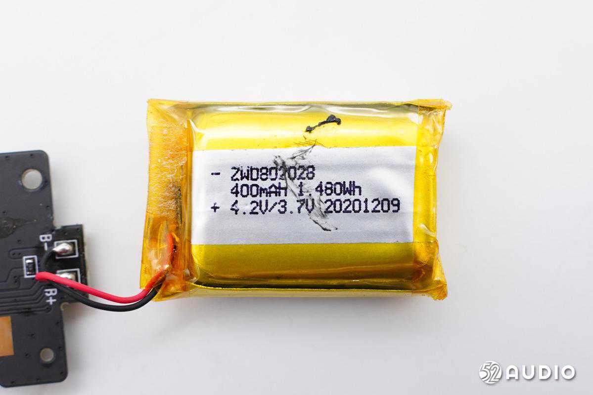 充电盒主板上的其他配置则有,来自ZWD众旺德新能源的软包电池,型号ZWD802028,电池额定容量400mAh/1.480Wh,配合耳机能够提供长达20小时的续航时间。