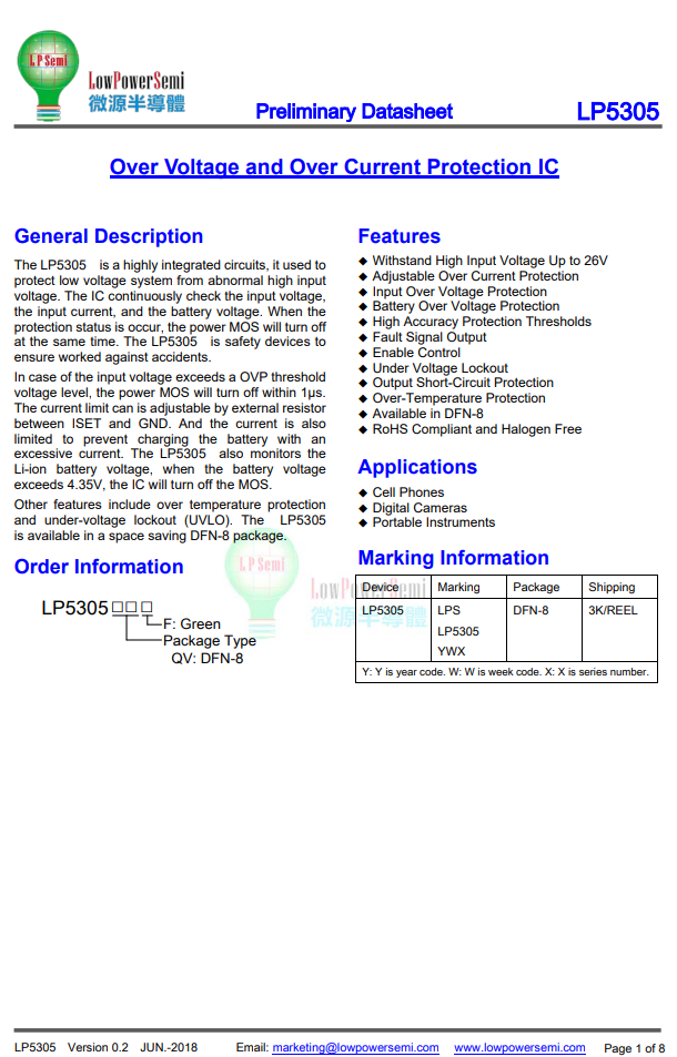LPS微源LP5305过压过流保护IC的详细资料图。
