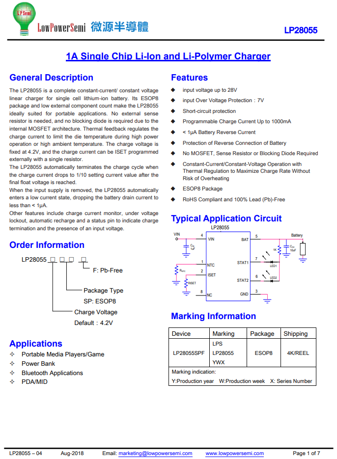 LPS微源型号LP28055是一款完整的恒流/恒压线性充电器,适用于单节锂离子电池。LP28055采用ESOP8封装,外部元件数量少,非常适合便携式应用。由于采用内部MOSFET架构,因此不需要外部检测电阻器,也不需要封闭二极管。