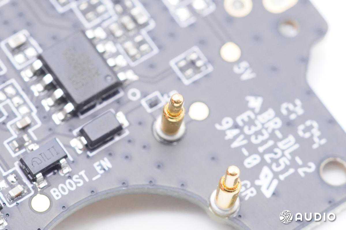 耳机电路上两个充电金属触点特写,用于为耳机充电。
