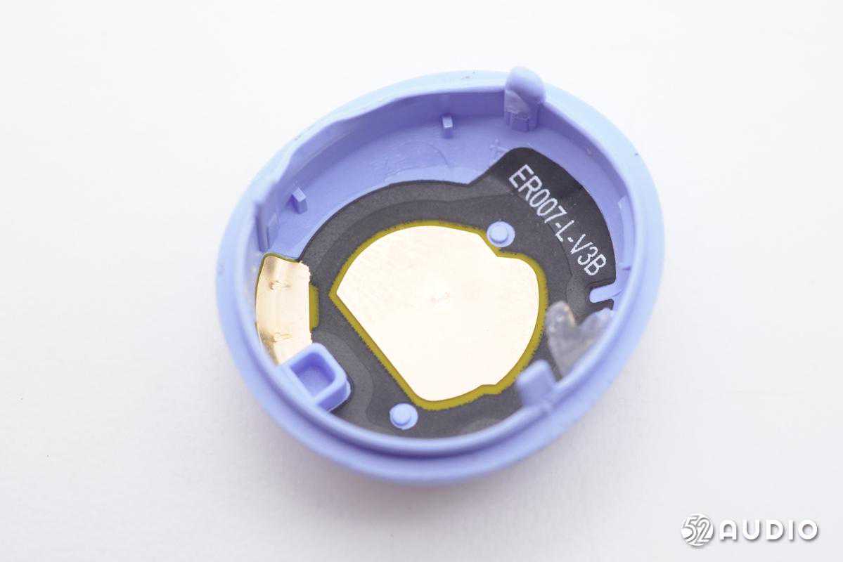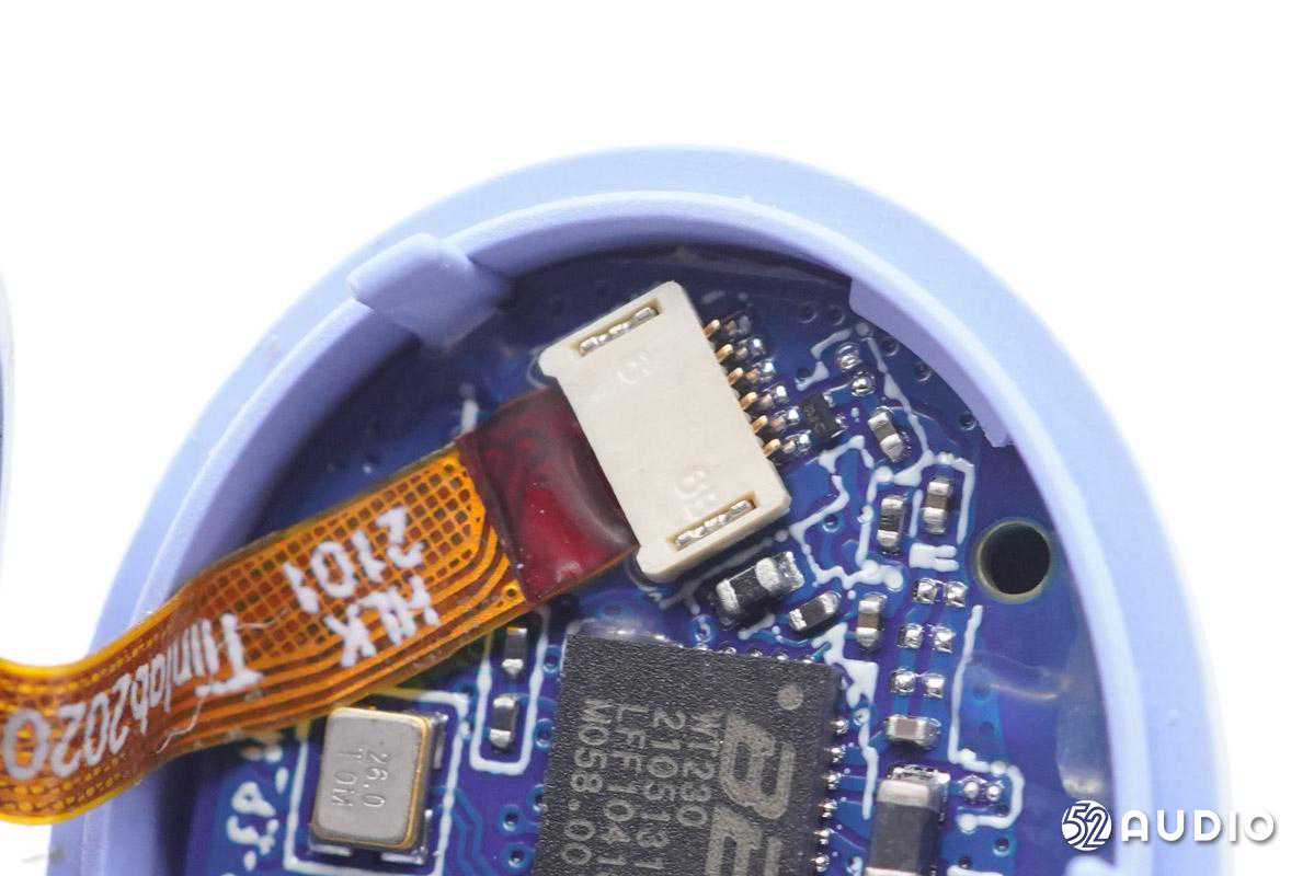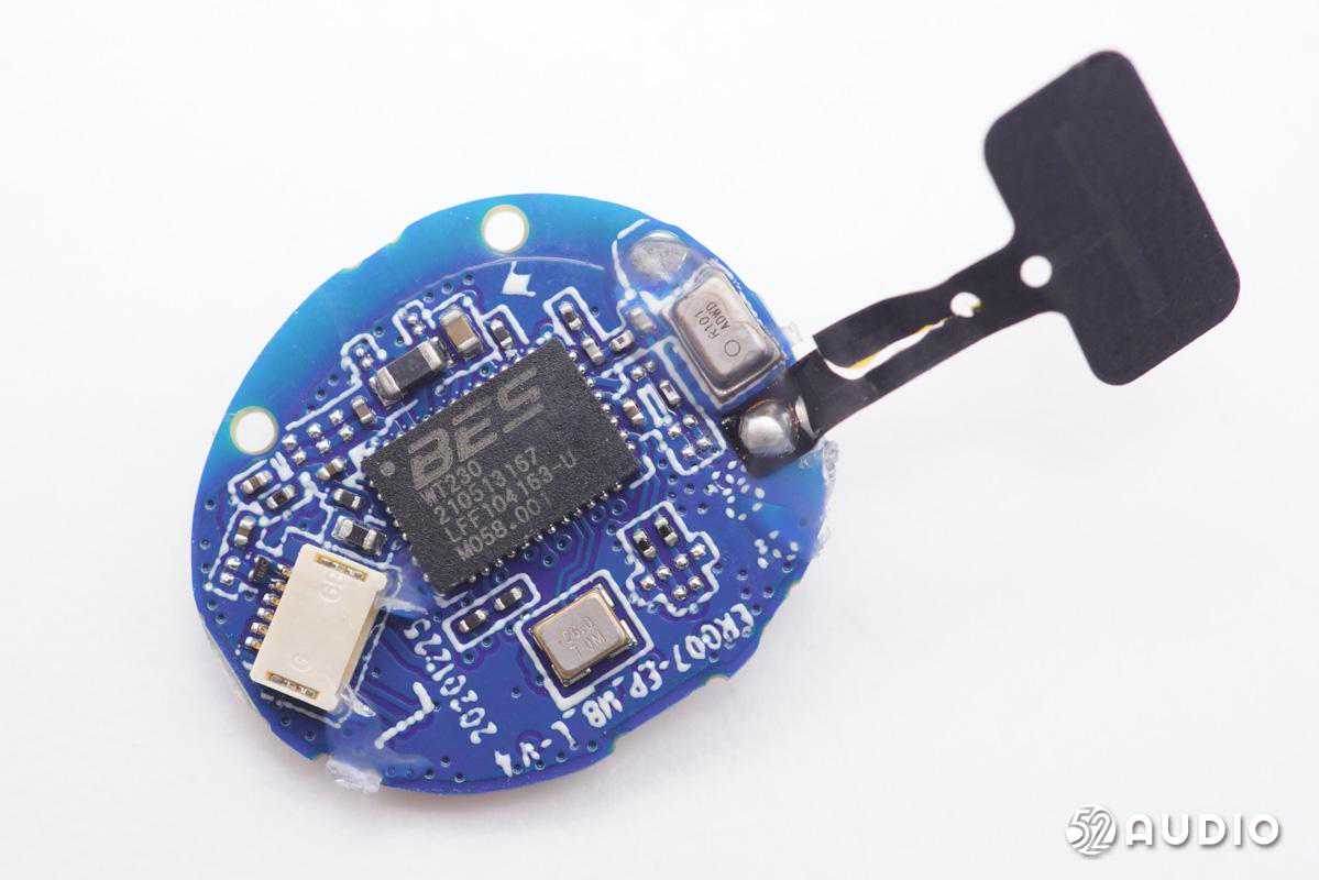 耳机后盖板内设有电容触摸贴片,用于实现耳机的触摸功能。在触摸检测贴片外圈是耳机的蓝牙天线,通过主板上的金属触点连接。