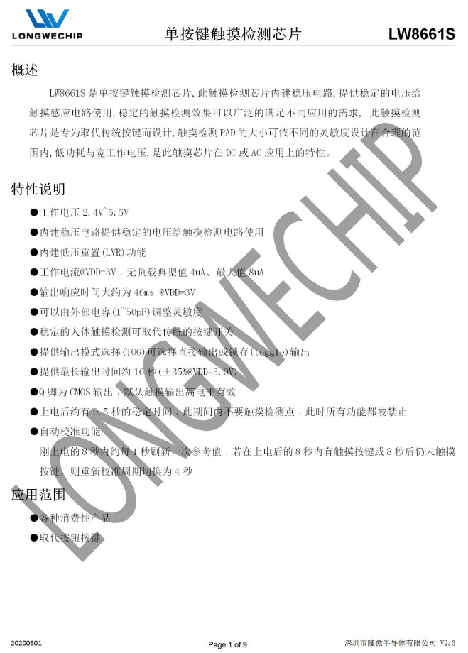 LONGWECHIP隆微半导体型号LW8661S单按键触摸检测芯片。功耗低,响应快,电源噪声抑制强且一致性高。