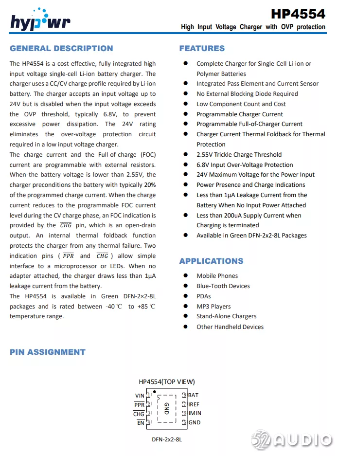 Hypower瀚昕微HP4554带过压保护的高输入电压充电器,输入耐压24V,6.8V过压保护,充电电流和终止充电电流可编程,用于耳机内置电池充电。