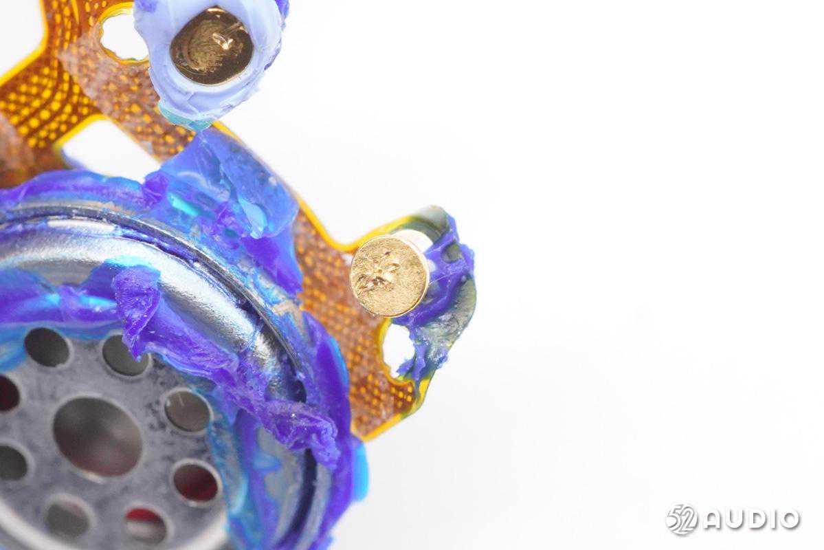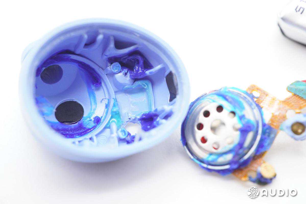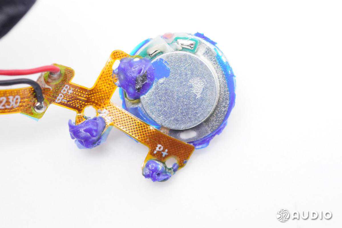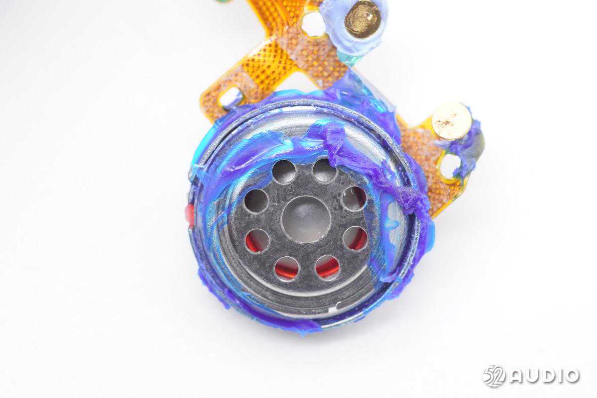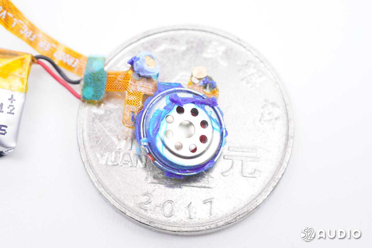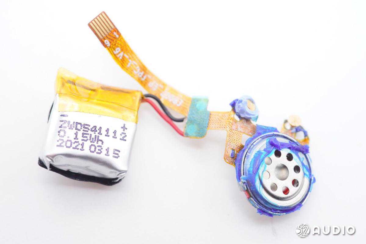 接着让我们一起来看一下耳机音腔内的布局,音腔内部的元器件通过胶水固定。在音腔内部右侧为吸附充电盒的磁铁,左侧是扬声器单元,磁铁与扬声器中间是充电触点所在的小板,两者均通过导线与主板相连。