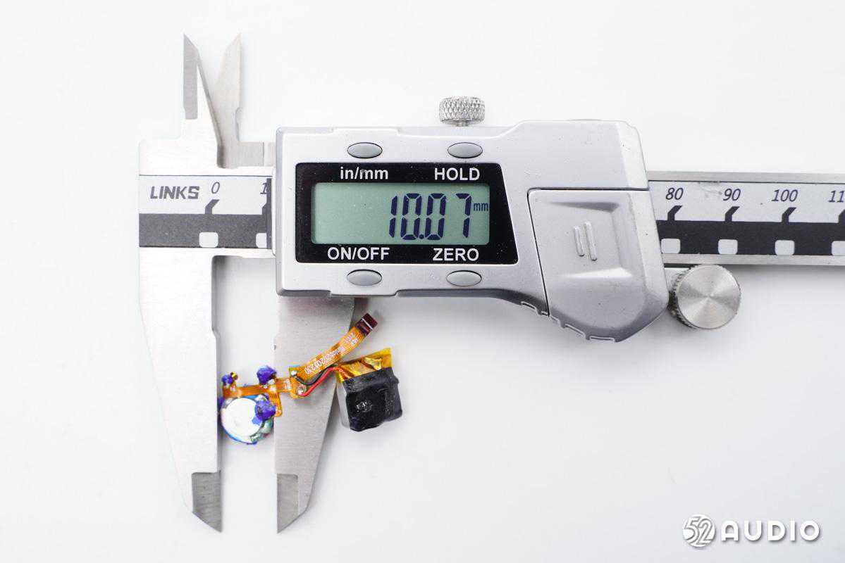经我爱音频网实测,realmeBudsQ2真无线耳机的动圈单元大小约为10.07mm。