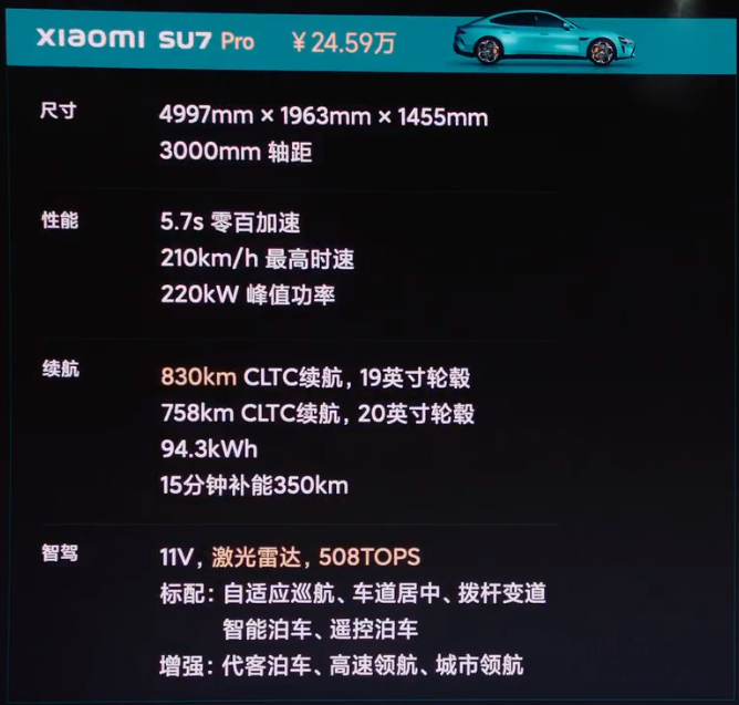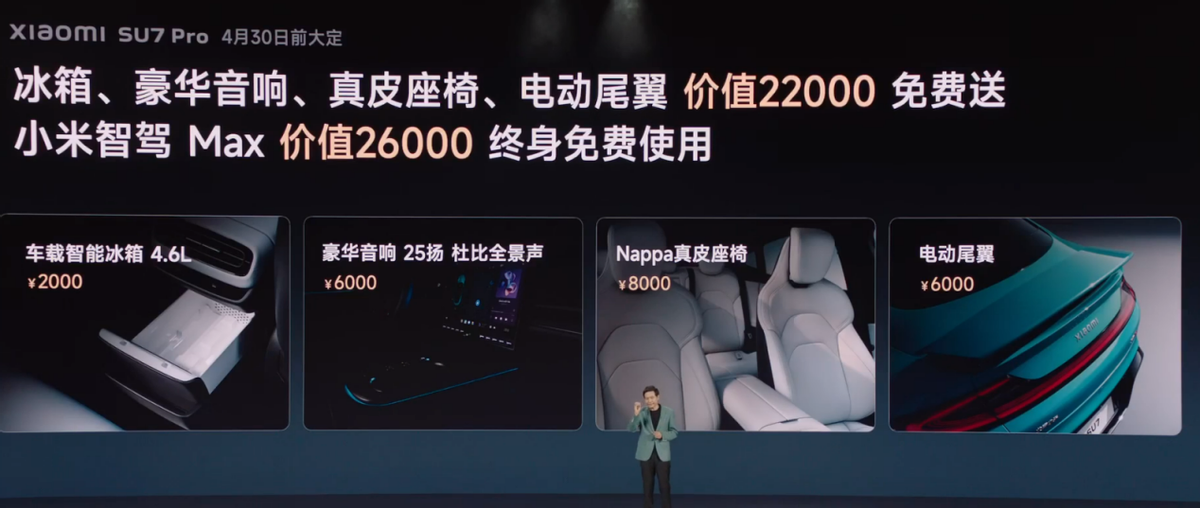 另外,4月30号之前大定,标准版和Pro版都可以免费升级冰箱、豪华音响和真皮座椅,Pro版额外免费享有价值6000元的电动尾翼,刚才说的豪华三件套的配置价值1万6,有个有意思的事情是如果你把这1万6减掉,你会发现标准版的裸车价是19.99万元,可以说雷总用另一种形式,回答了那句玩笑话;