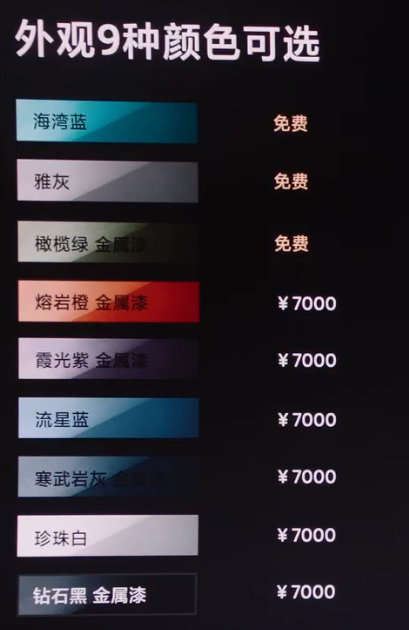首先,外观上小米SU7有9种颜色可选,除了之前在店里看到的海湾蓝和橄榄绿之外,还有雅灰、霞光紫、熔岩橙、珍珠白、钻石黑、寒武岩灰、流星蓝,选择是够多的,但只有海湾蓝、橄榄绿和雅灰是免费,其他都需要加7000块。