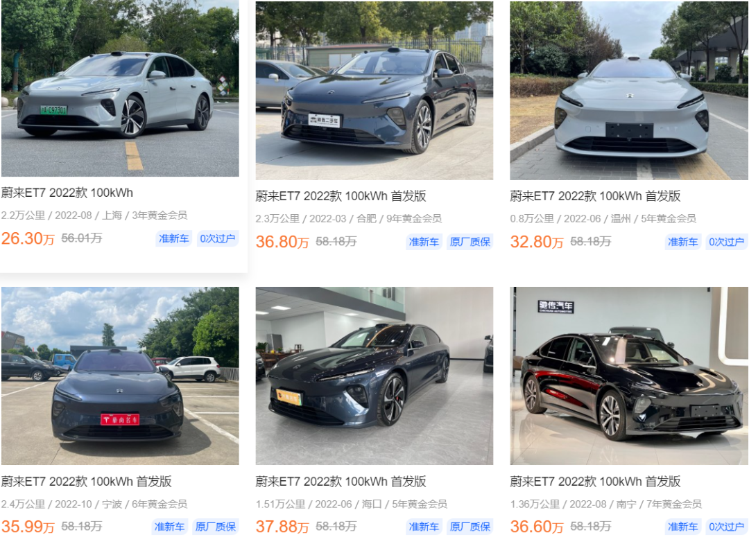 在2021年ET7上市时,新车售价区间为45.8-53.6万,比BBA的中大型轿车还贵,但由于蔚来提供电池租赁和整车购买两种销售模式,所以前者新车售价要便宜7-12.8万。目前在二手市场上,电池租赁的二手ET7价格已经降到了26、28万。其中,75kWh和100kWh两个版本每月租金分别为980元、1680元。要是你不喜欢交月租,也可以选择购买带电池的ET7,视续航和配置不同,二手价在34-38万之间。说实话,这个价格并不算非常便宜,但考虑到二手ET7车龄很短,而且也完全不需要担心电池健康问题,用便宜10多万的价格,就能买一辆跟新车体验没区别的准新车,这么算还是不错的。