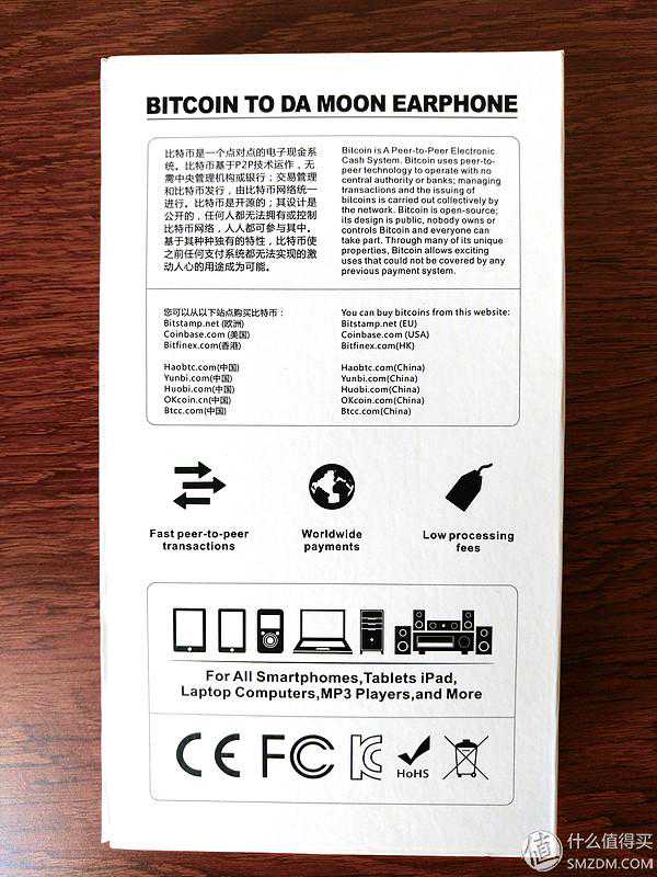 盒子背面唯一的中文是对比特币的介绍,没有说耳机参数的半个字