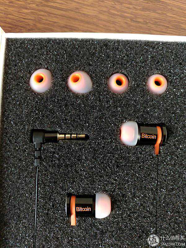 耳机主体和附赠的两幅硅胶套,机身上刻着比特币的英文,似乎满满的山寨味道。