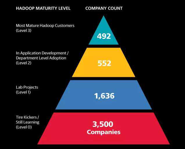 总的来说,我们发现只有2680个公司在某种程度上使用Hadoop,在这些公司里面,1636个的技术采用成熟度是非常低的,这些人只是刚刚开始尝试新技术,参加兴趣小组和技术会议来学习大数据或者尝试做一些入门探索性的项目。另外552个在更高的一个级别,他们已经开始在内部比较小型的项目中用Hadoop(部门的项目或者公司本身就是一个初创公司)。只有492个是在进阶的技术状态,这些公司有一个比较大型的项目投入产品并且有员工对Hadoop有一定的经验。