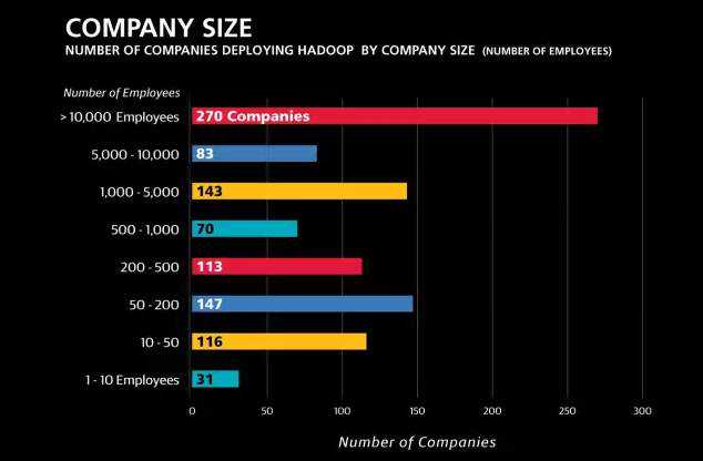 我们惊讶的发现,大型公司(5000人以上)开始使用大数据技术的速度要远远高于小型公司。一般人很可能会猜小型或者历史比较短的公司会更愿意采用新技术。但是对于大数据,现实情况正好相反。我们发现大型公司中有300个对于Hadoop非常重视已经进行了技术投资,而相对比之下只有300个5000人以下的公司是Hadoop用户。考虑到中小公司的总数目是大公司的10倍,这也就是说Hadoop在大公司市场的占有率是中小型公司市场的10倍。