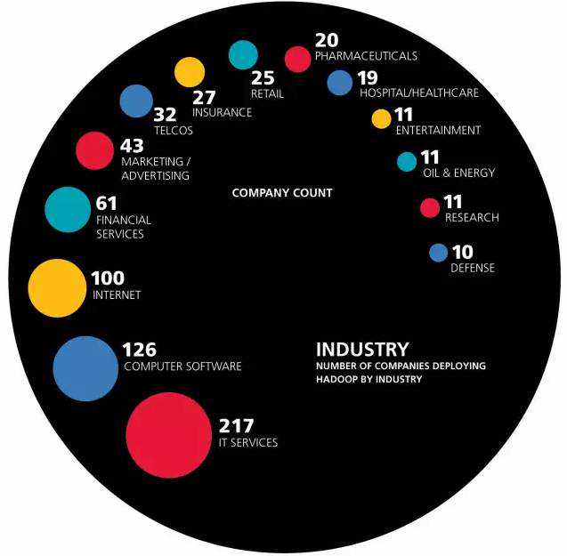 油气公司和医药公司一般来说都有非常多的数据集,但是我们的分析表明他们并没有很多在使用Hadoop。然而金融行业虽然传统上并不是可以快速采用新技术的行业,却很快地使用了大数据技术。