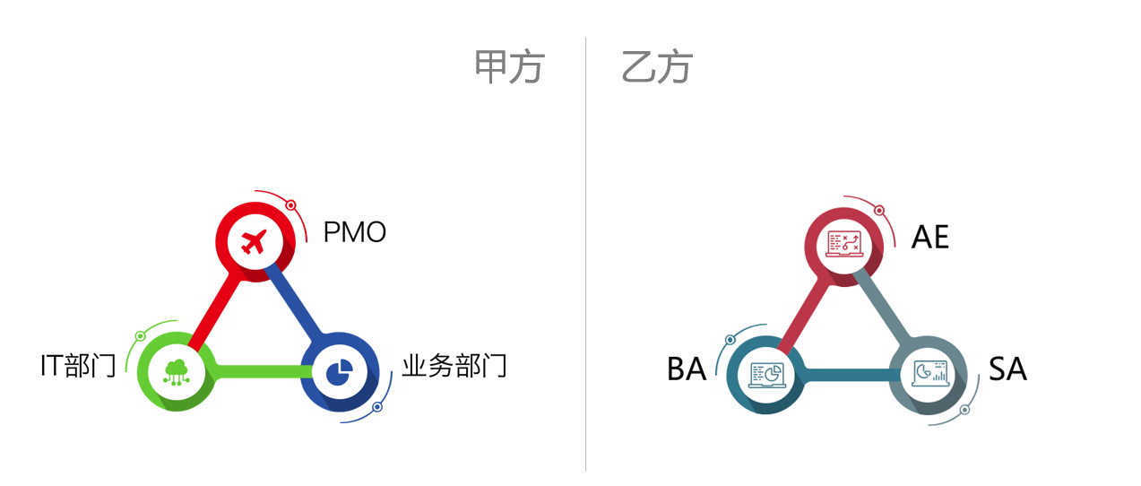 补充:甲方的铁三角可以对应乙方的客户专家团队铁三角、项目交付团队的铁三角。区别是客户专家团队的铁三角对应的甲方人员的级别更高一些,如CXO级。