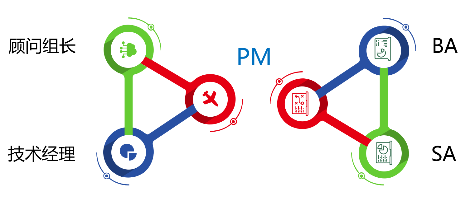说明:专业线的BA+SA不需要长期在项目里,可在关键节点上投入;并且BA具备的能力,是可以随时替换PM的。在人员的安排上可以根据项目、资源情况灵活调整。