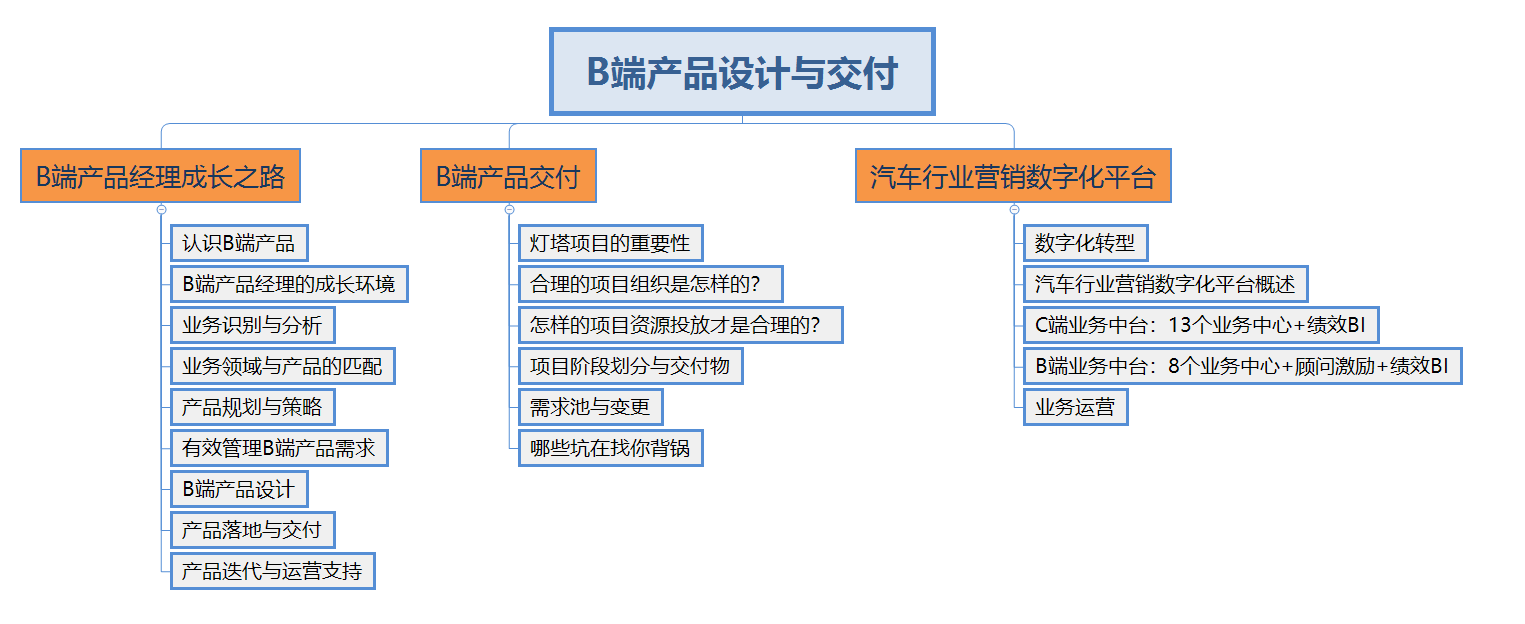 除了《B端产品交付》专题内容外,还推出了《汽车行业营销数字化平台》、《B端产品经理成长之路》2个专题,按照产品+交付+行业案例的方式,全面呈现一个行业产品从业务到产品、从设计到交付运营的全过程,预计超过80篇文章。高单价产品的有汽车、房产、医美、教育、装修等行业,产品、运营有很多类似,可参考。