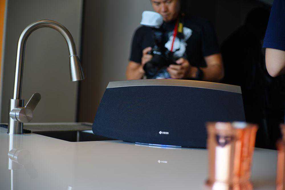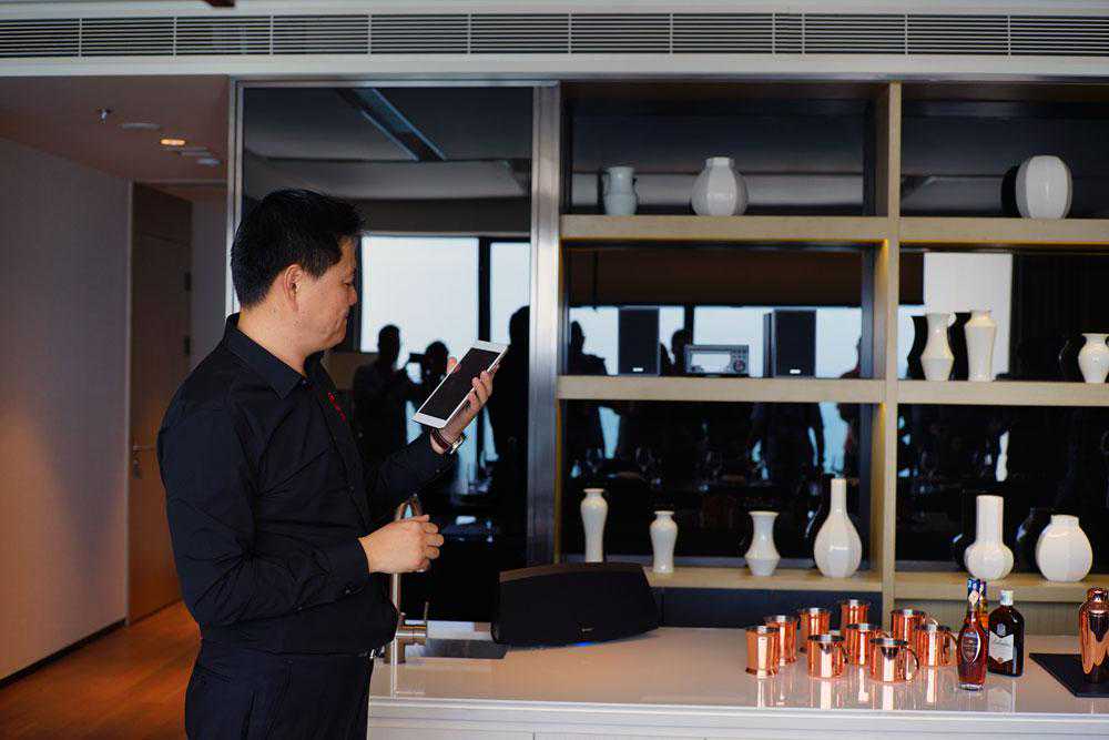 HEOS的演示,是放在酒店顶层的行政套房中演示的。这个行政套房有三个厅一个卧室。而SU的工作人员在这个房间的很多地方都放上了HEOS品牌,或者支持HEOS(天龙、马兰士AV功放)的各种产品。