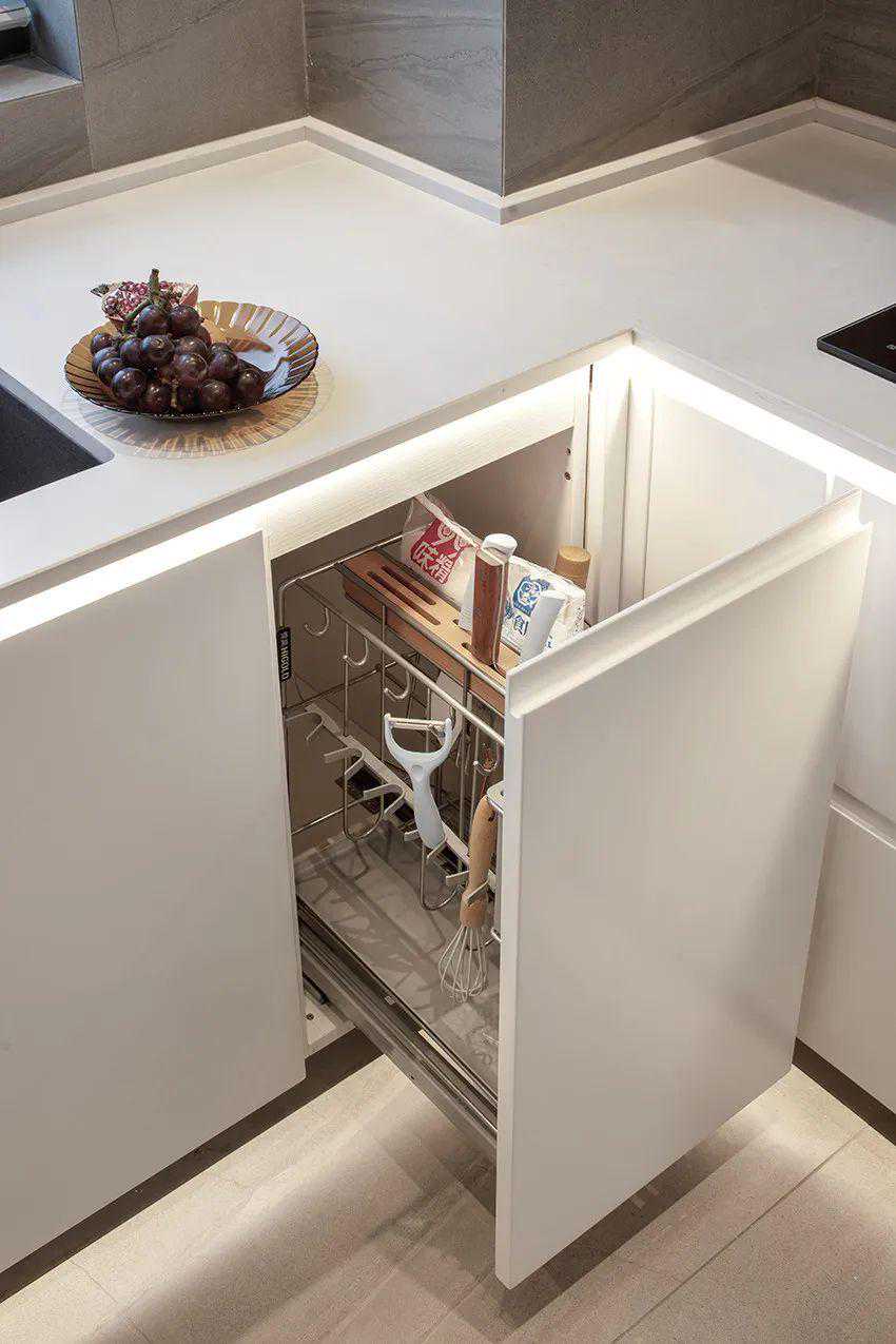 隐藏在白色橱柜下的拉篮是“万金油”,即方便取用、提高烹饪效率、又能保证餐具卫生,降低餐具的损耗,属于中产的调味品、双立人儿刀具都有了归处。