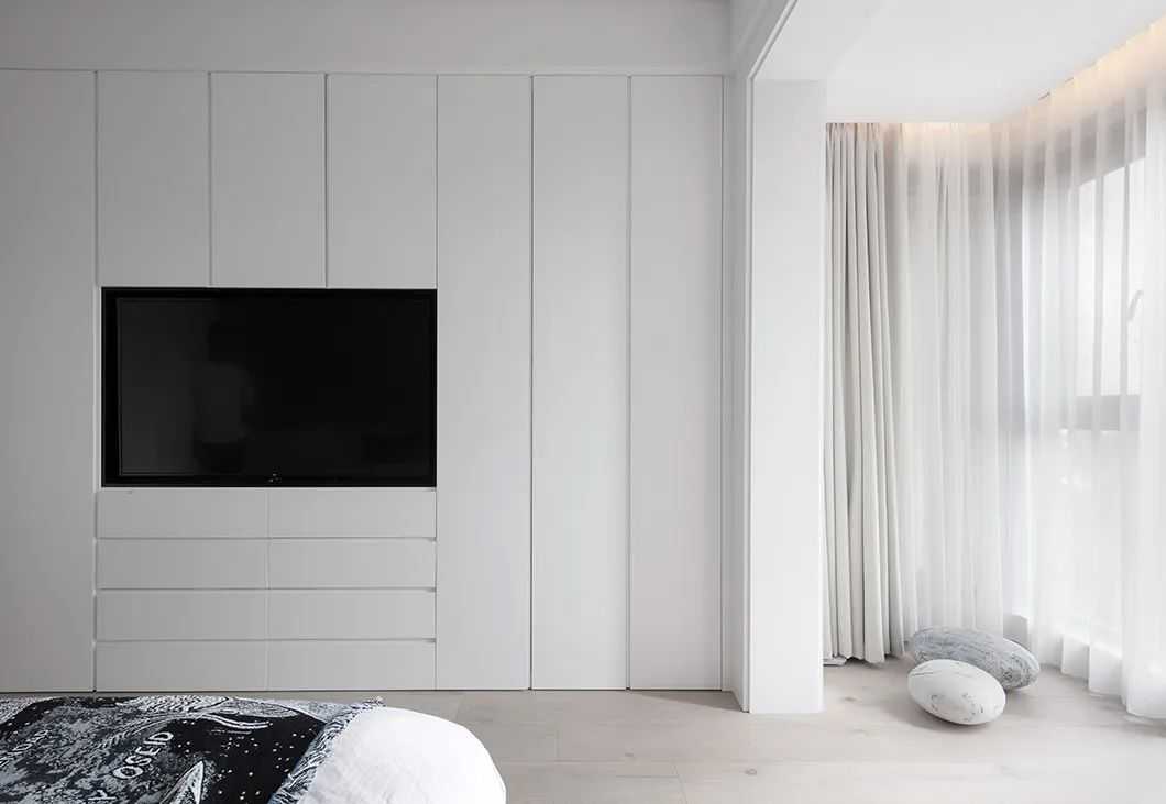 卧室以黑白灰为主调,不同花纹肌理来呈现层次感。亲肤的鹅卵石抱枕,可靠可坐,俏皮又富有禅意。