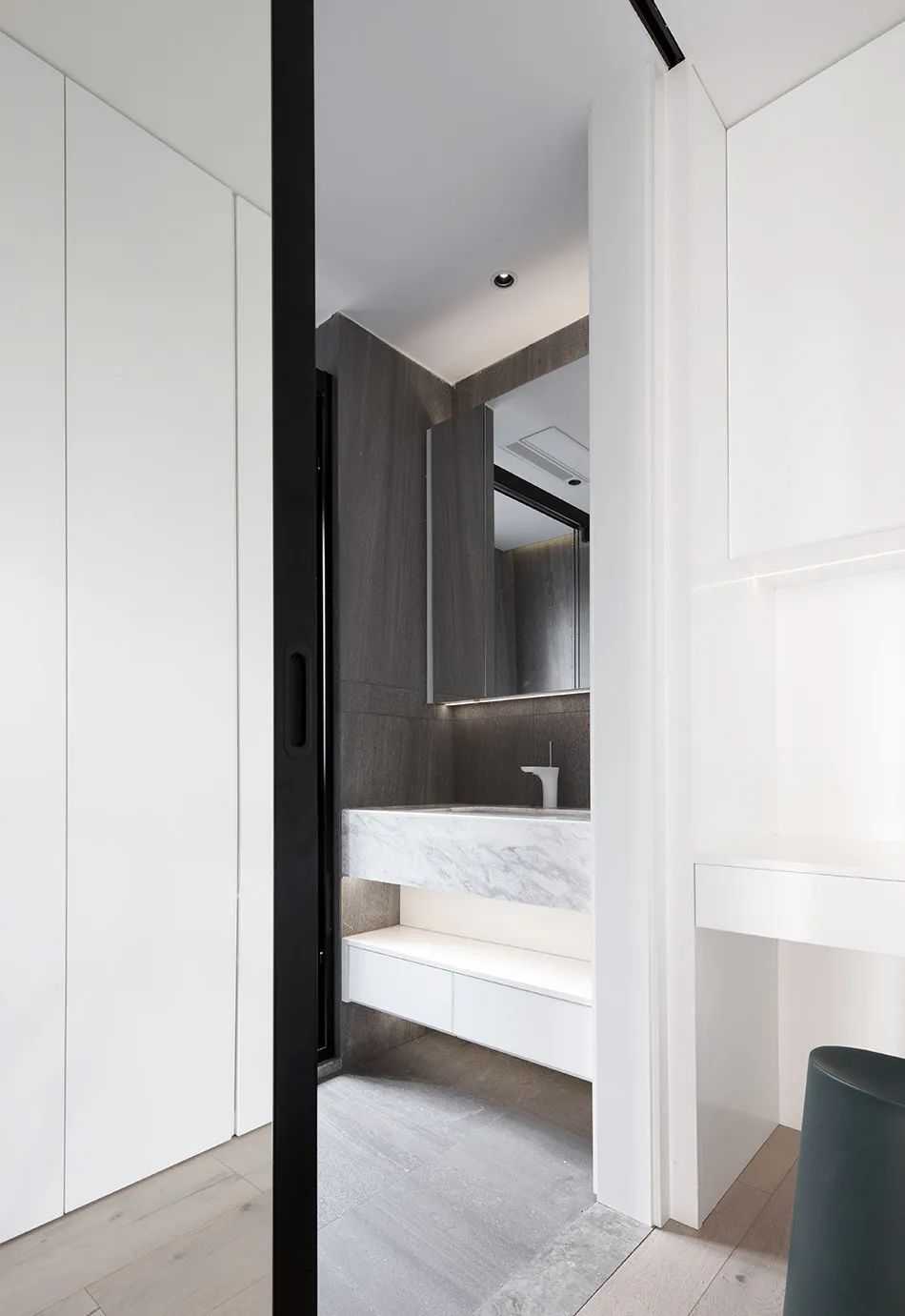 空间只契合当下的生活。物品尽量简化,尽可能地收纳起来。目之所及都是自然的底色,灯饰也化作线性灯带,间接光源烘托柔和的氛围。