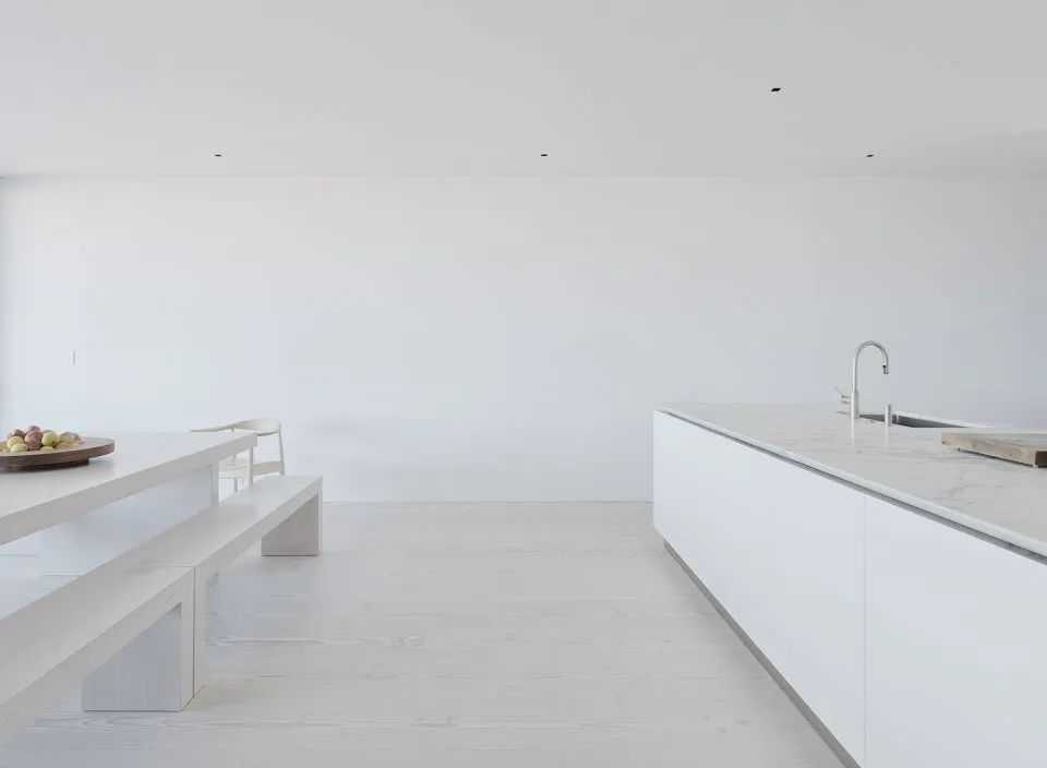 基于房主在审美上对纯净、留白以及极简主义的热衷追求,整栋住宅以Dinesen白色花旗松木地板为基调,构建出不同的白色空间。