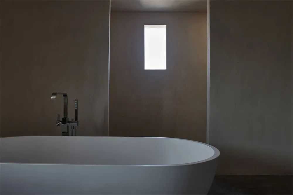 客厅保留混凝土天花的粗犷,地板延展着法国橡木的有机纹理,墙壁则以设计师自调的土坯围合,表达自然的力量。