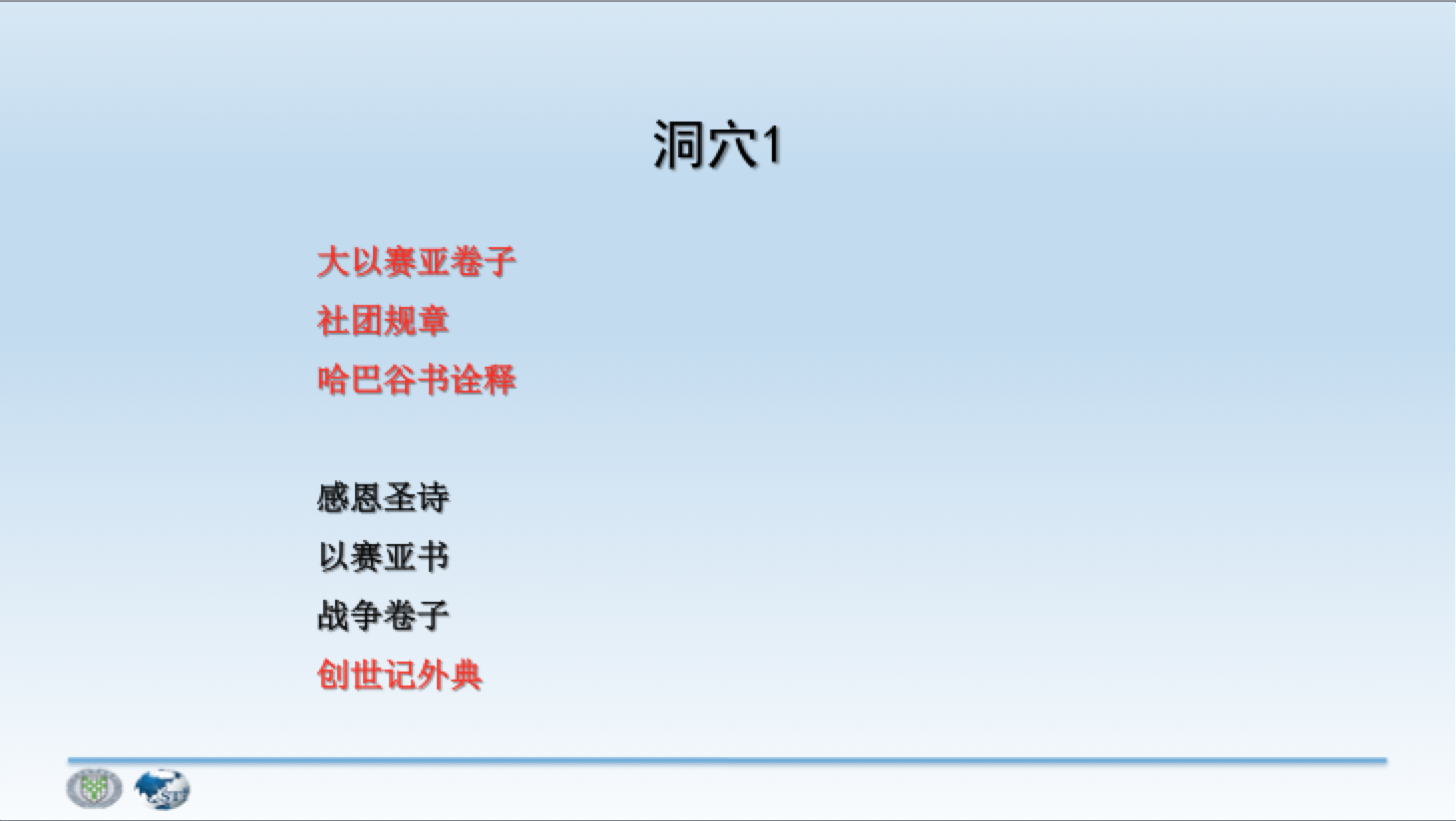 在洞穴1里边发现了这些卷子。《大以赛亚卷子》顾名思义是比较大的,是对《以赛亚书》几乎完整的抄录。相比之下还有一份不是很完整的《以赛亚书》抄本。一般来说,死海古卷的标号格式是先写一个数字,指的就是昆兰的洞穴号,然后再写一个Q表示昆兰,然后写上比如Isa表示《以赛亚书》,再用右上角上标字母a或者b来表示不同的卷子,它们是同一份文本或经卷的不同抄本。《死海古卷》里不仅有我们现在认为是《圣经》经卷的内容,还有一些和他们的宗派相关的内容,另外还有一些当时有可能被认为具有经典地位,但现在已经不再被接受的书卷。我标红的这四份是被单独买下的,而另外三份则是后来被另外一个人买下,最后又合到一起的。