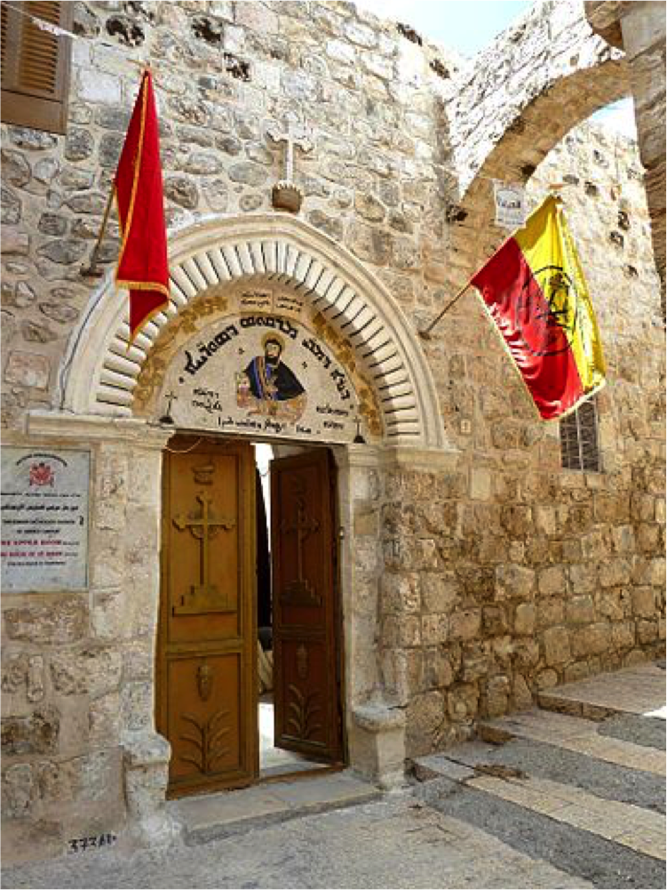 于是,到了夏天的时候,都主教就花了24英镑买下了4份古卷。买下古卷后,他就到处去询问其真实性,结果他问的所有人基本都说这不太像真的。其实他的询问有点所托非人,因为那些人基本都是研究阿拉伯或者是奥斯曼土耳其文献的,所以他们看希伯来的东西可能看得不太准。都主教有一个朋友叫布特鲁斯·索米,索米有个兄弟叫易卜拉欣,请不要被名字误导,这些全都是叙利亚正教会的人,不是穆斯林。索米的这个兄弟是一个业余的历史学家,他认出来这些卷子应该挺古老的。我给大家看的这张图就是都主教撒母耳的驻锡地,门头上面写着的就是圣马可修道院的字样。