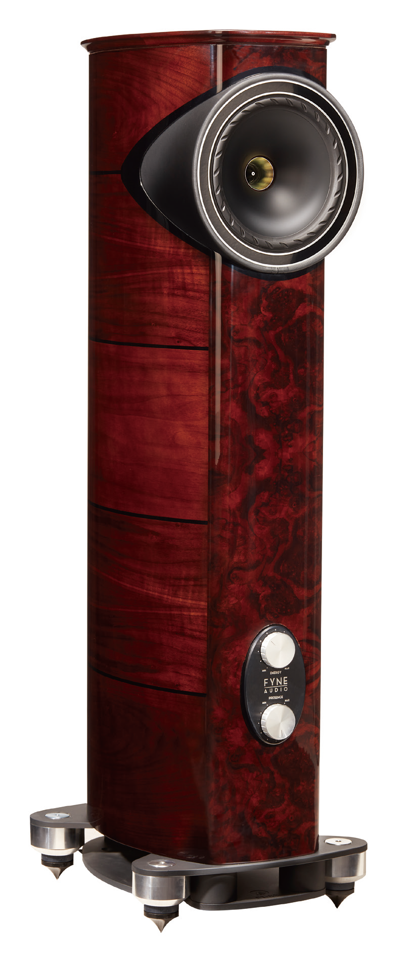 FyneAudio有自己的Bass-Trax专利技术,并且在箱体底部关键部位使用了向下倒相、360度气流均匀扩散和排出的Bass-Trax技术。当中低音倒相气流通过一个类似圆椎体形状的设计的专利导管,可360度全方向均匀扩散,低音向下疏通,然后扩散到四周,有利于获得丰满、清晰有力的低音效果以及平顺的中低频响应。