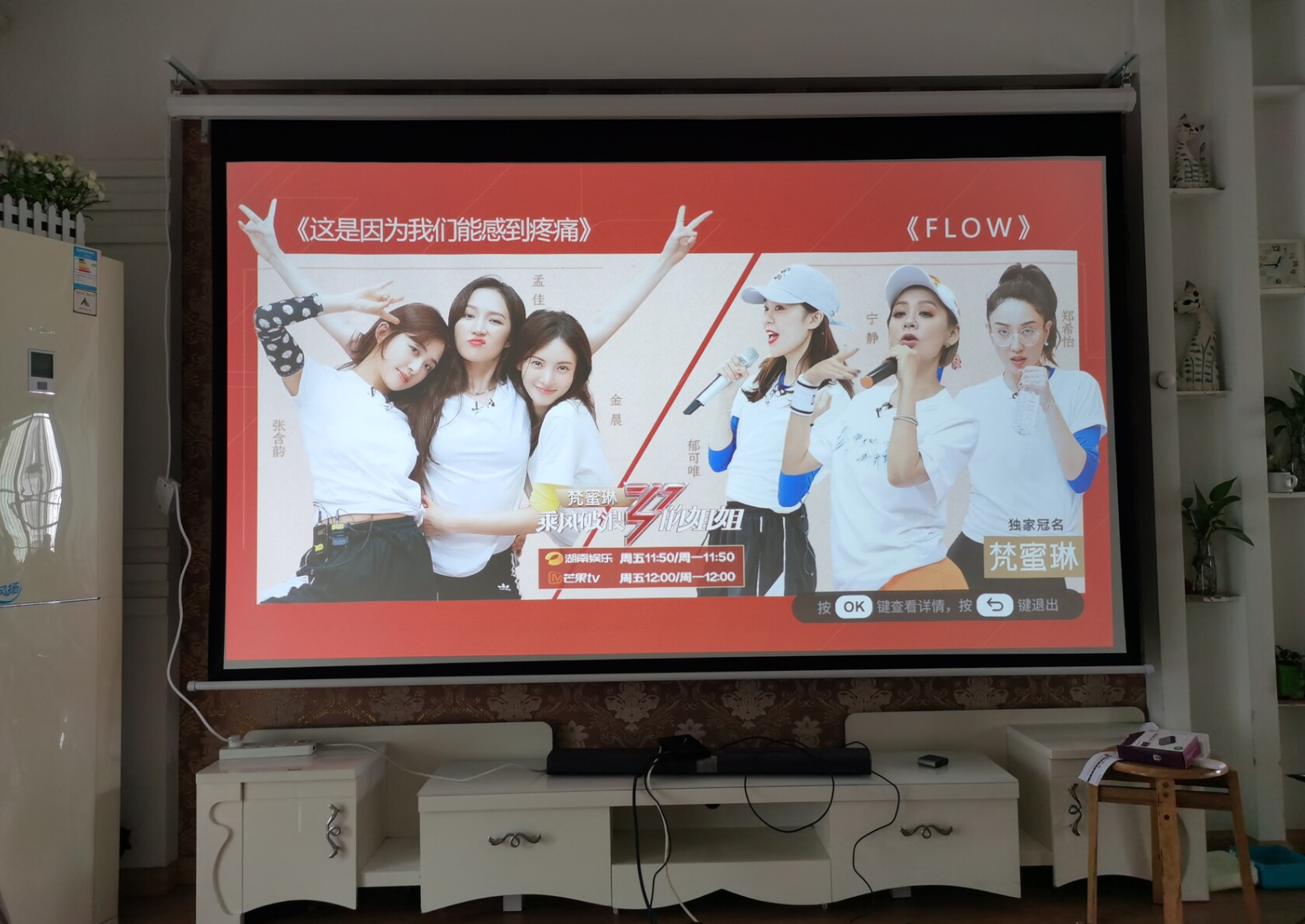 1、虽然是白墙,投射的投影画面,真的很清晰,但是每次看电视都需要坐在地上看,难免有点奇怪,电动幕布肯定是要买了: