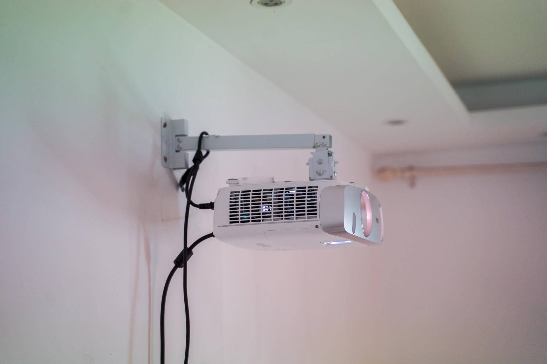 10、投影仪的位置大概和幕布平行就可以了,根据之前的投影计算器,找到了一个位置进行安装: