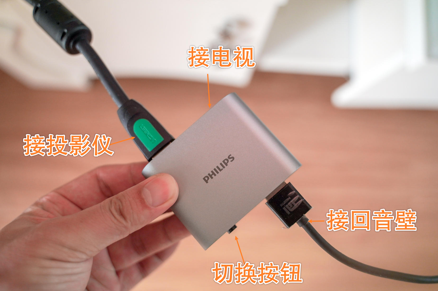 3、如果要电视和投影仪两用,建议用这个HDMI分线器,按一下就可以切换到投影或者电视!