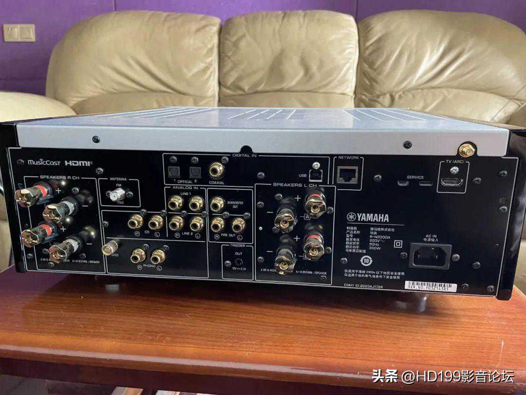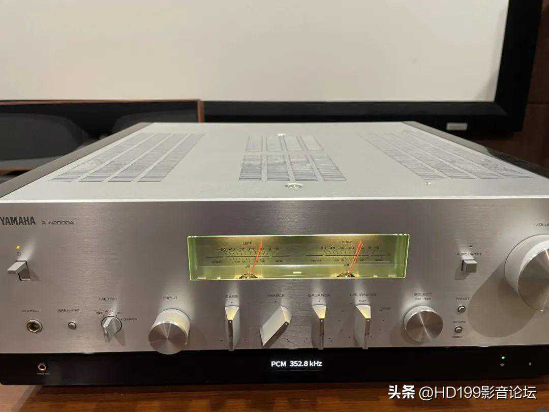 首先,外观:雅马哈N2000A是个做工非常优质的产品,复古UV表盘左右钢琴烤漆设计,前面板铝合金拉丝,下面的LED显示屏显示信息很实用,镀银铜质底脚,坚固稳定性很好,后面接线端口做工很有质感,端口也很丰富,外接设备有很高的拓展性。