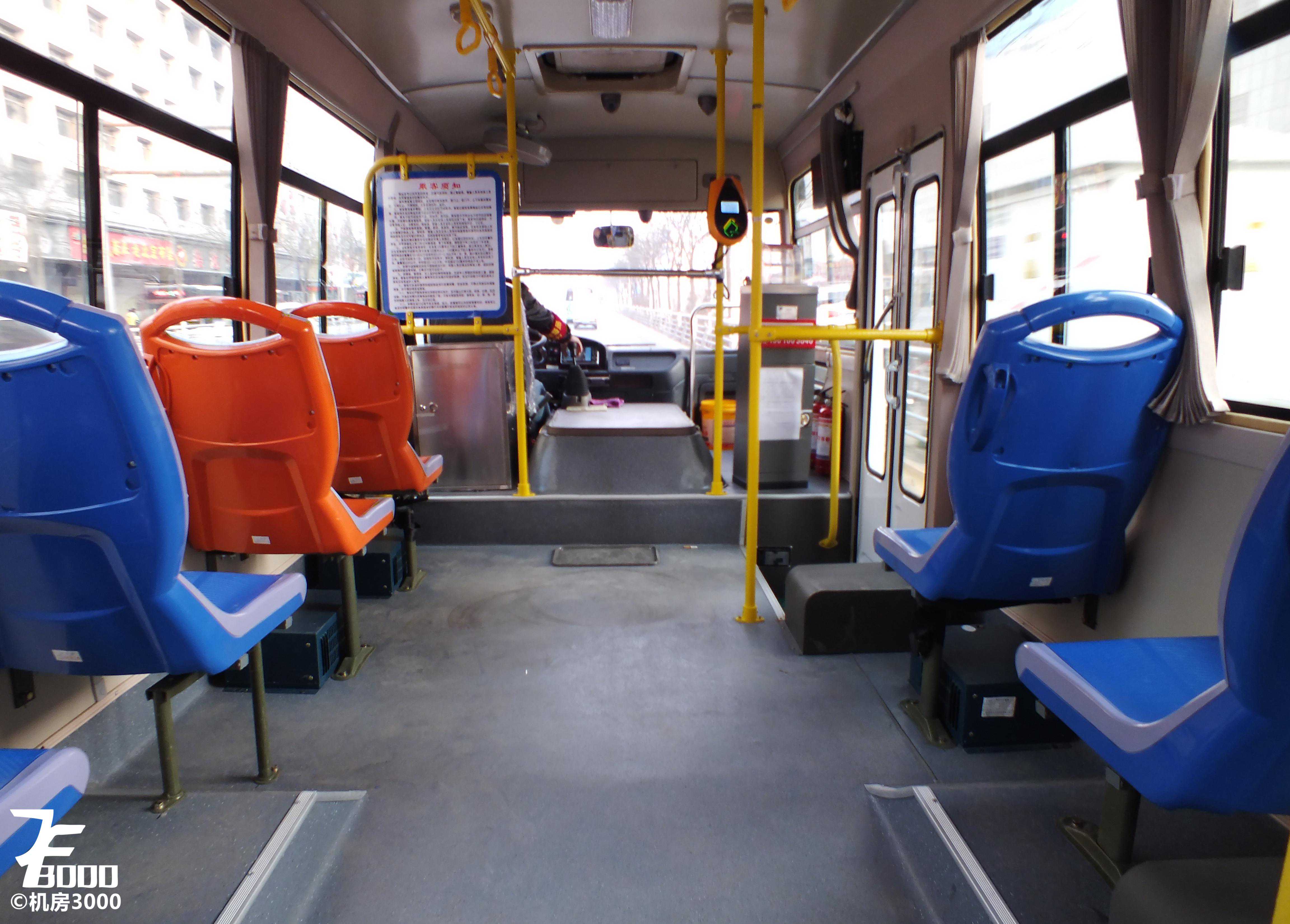 车内1+1布局,最后一排三座,座椅为春山硬塑桶座。由于是中后门布局,不仅浪费了大量空间,也不利于司机观察投币刷卡情况,而且后门空间非常局促,从后门下车的体验非常糟糕,其实对于6-7米的公交车,大鼻子造型更加合理,空间利用更加合理,上下车也方便,最近兴起的纯电动前中门布局则更优。车内高度尚可,一米八的乘客站在车内不需低头