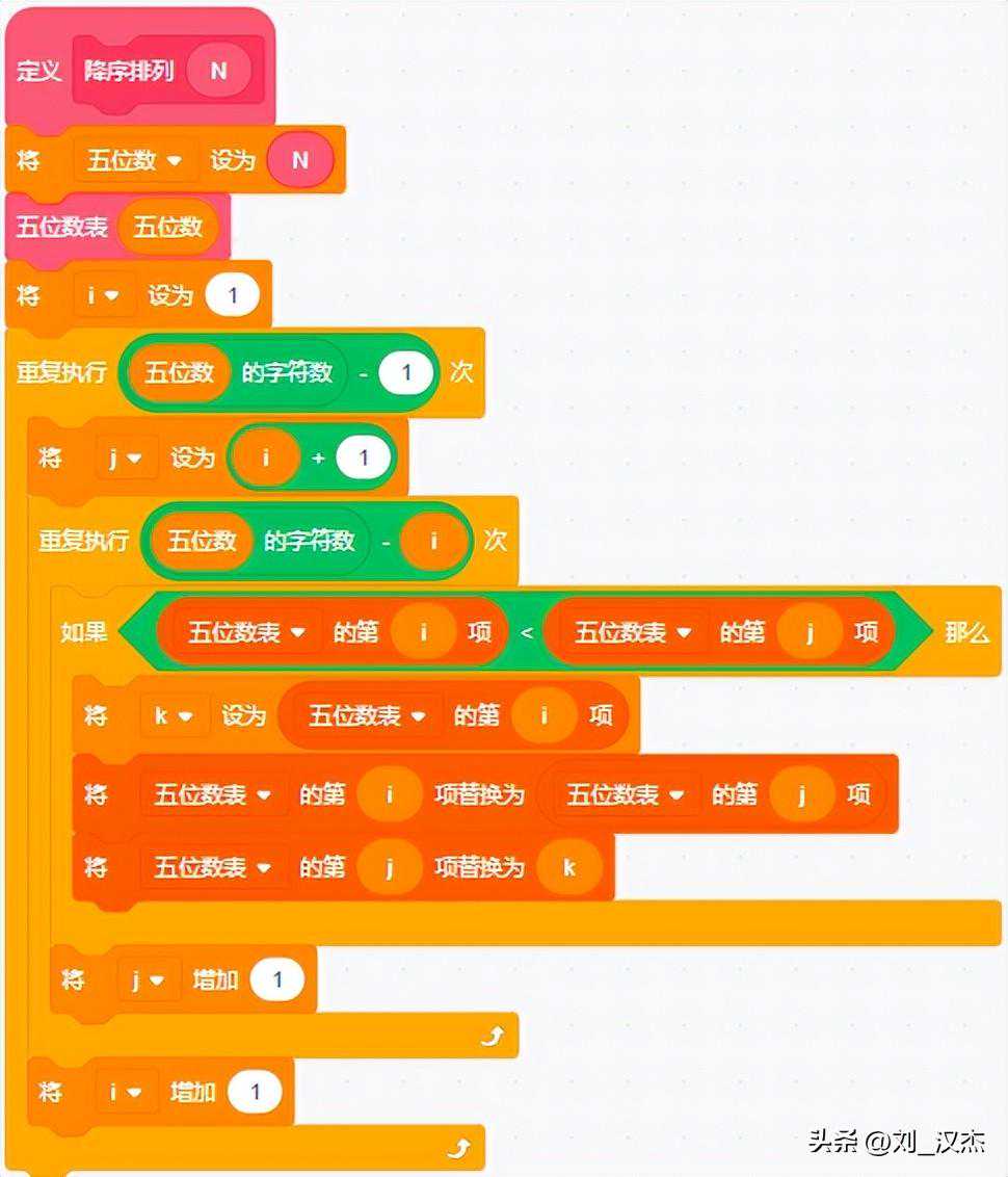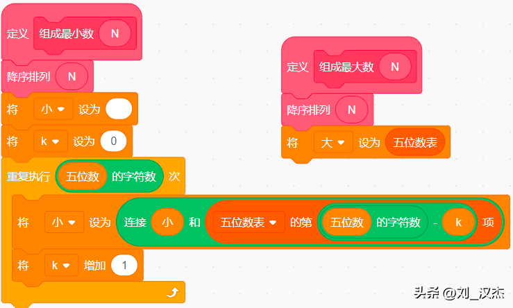 (4)根据排序后的“五位数表”,生成大数和小数,存放在变量“大”和“小”里面,由于Scratch可以将数字字符串列表中的数按序组合成数字,因此大数可以直接生成: