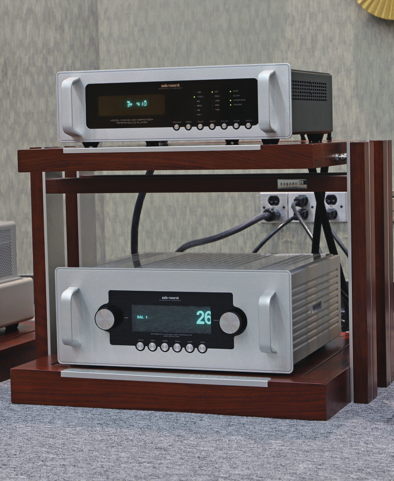 现场搭配AudioResearch经典的Reference(参考系列)CD9SECD播放机/数模解码器(上)和Reference6SE电子管前级放大器(下)
