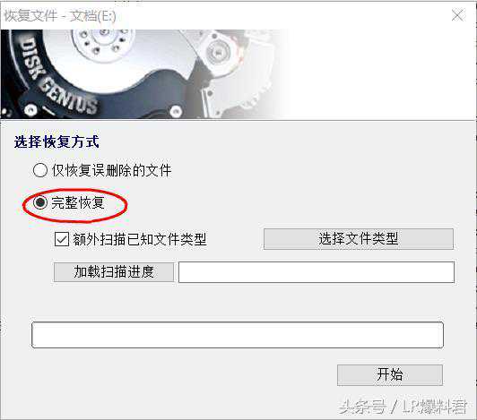 ⑤选择恢复方式,如果磁盘不是因为格式化而引发的数据丢失请选择“仅恢复误删除的文件”,如果你不清楚或者不理解,直接选择“完整恢复”就行(如果扫描过程被中断,旁边还可以选择加载扫描进度)。