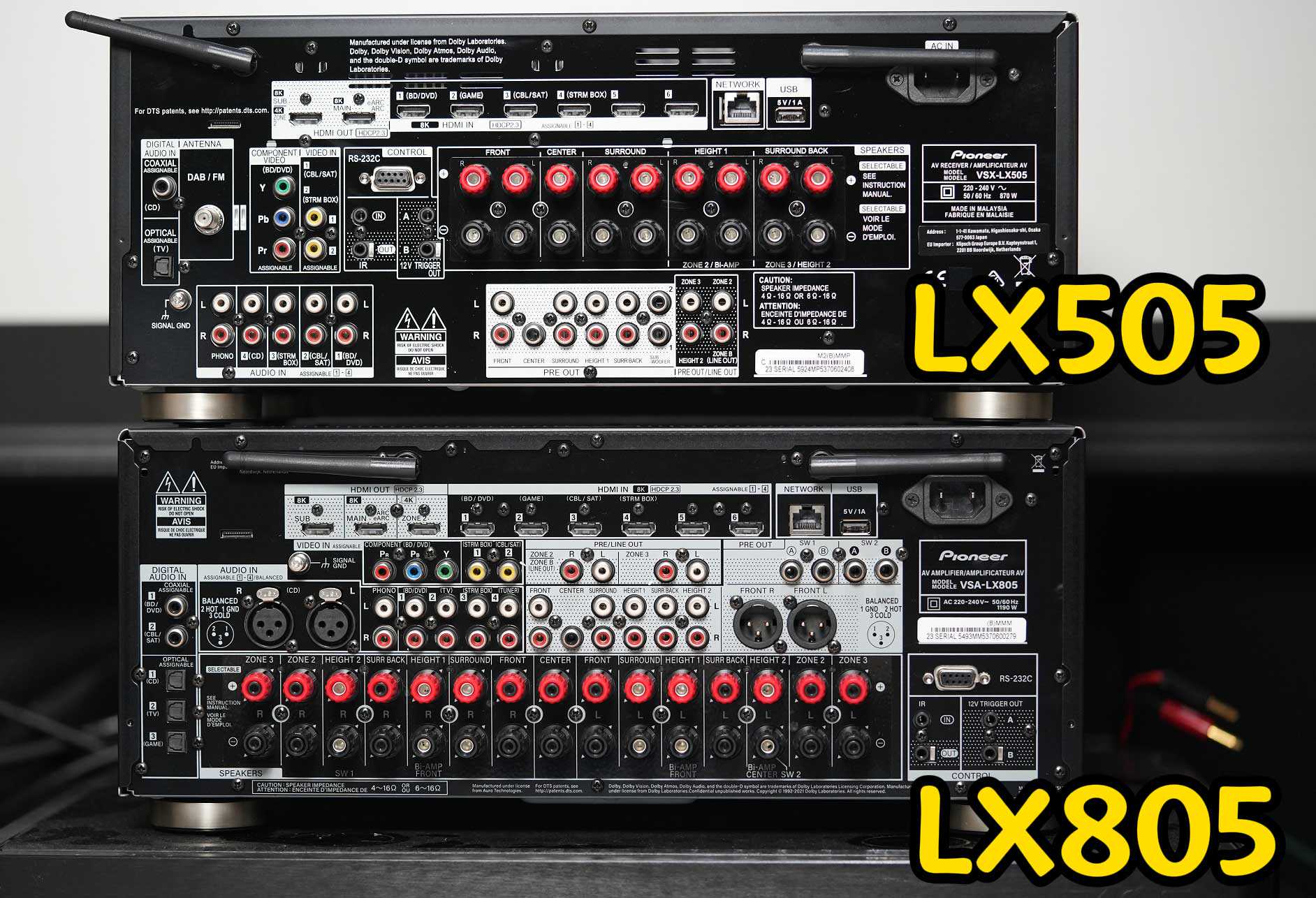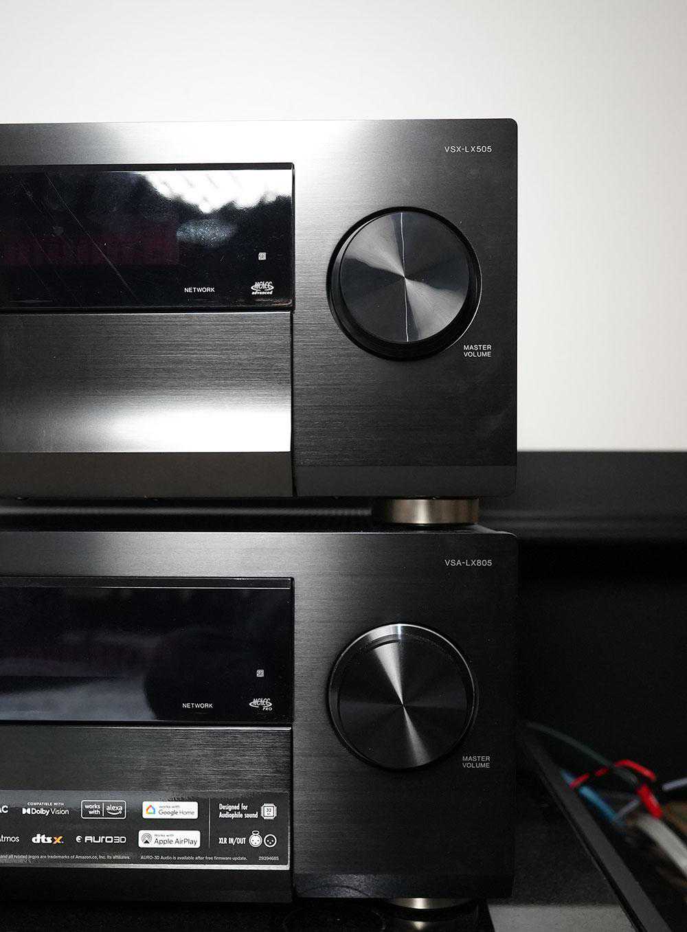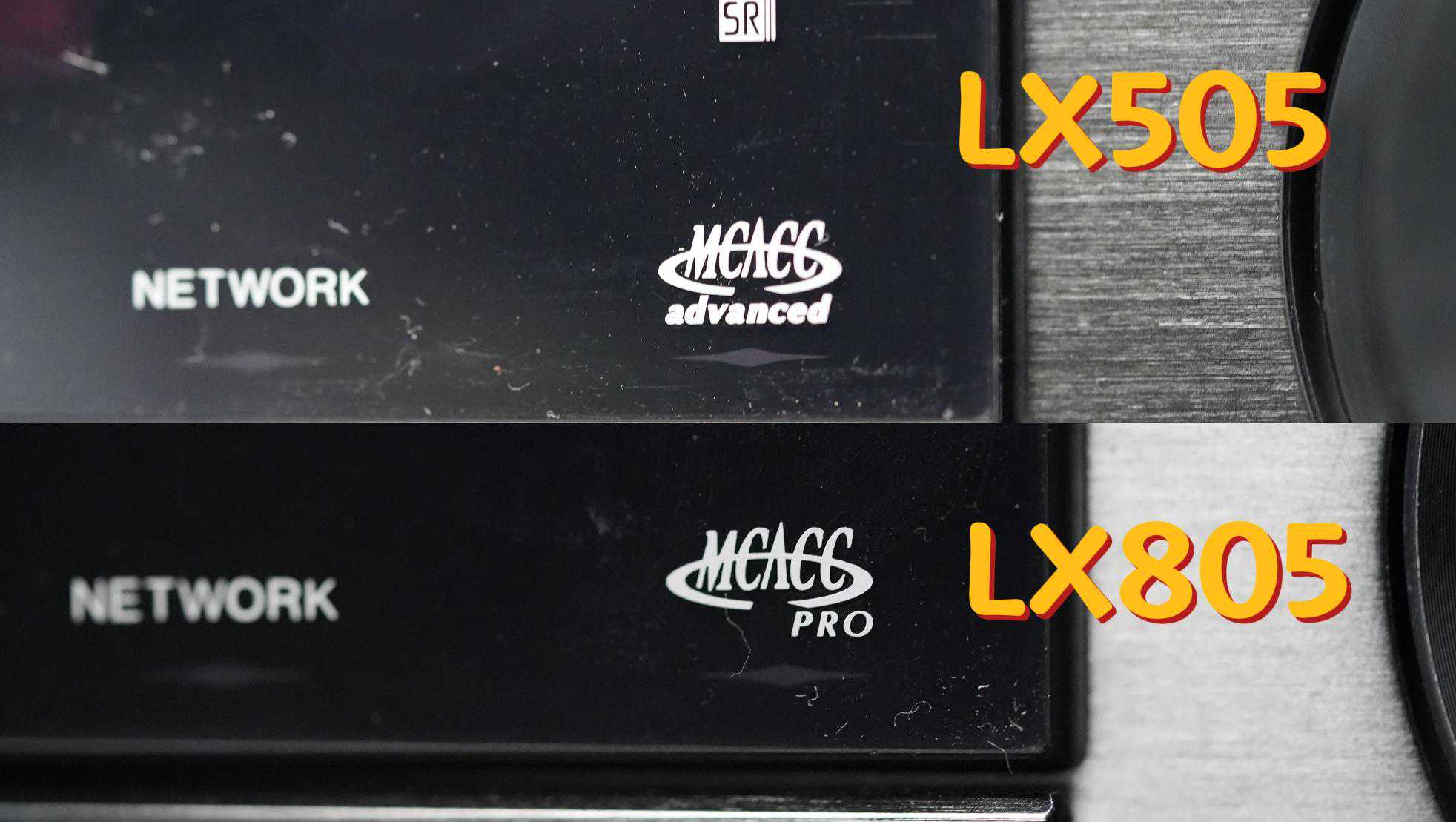 前面板上面还透露出一些差别,比如他们的先锋自动声场修正技术MCACC版本是不一样的,LX505是ADV版,而LX805是PRO版。