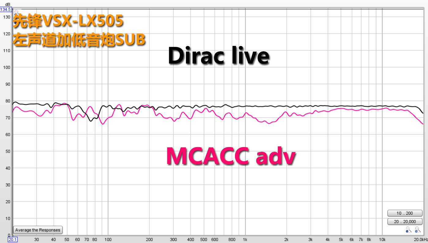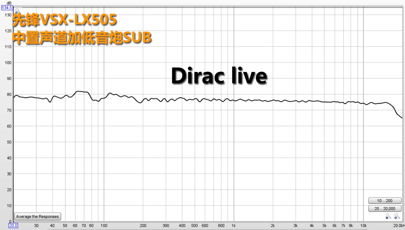 相对于MCACC不处理透声幕影响高频的做法,Diraclive是进行了相应的处理。最终Dirac之后的中置音箱加低音炮频响如上图。