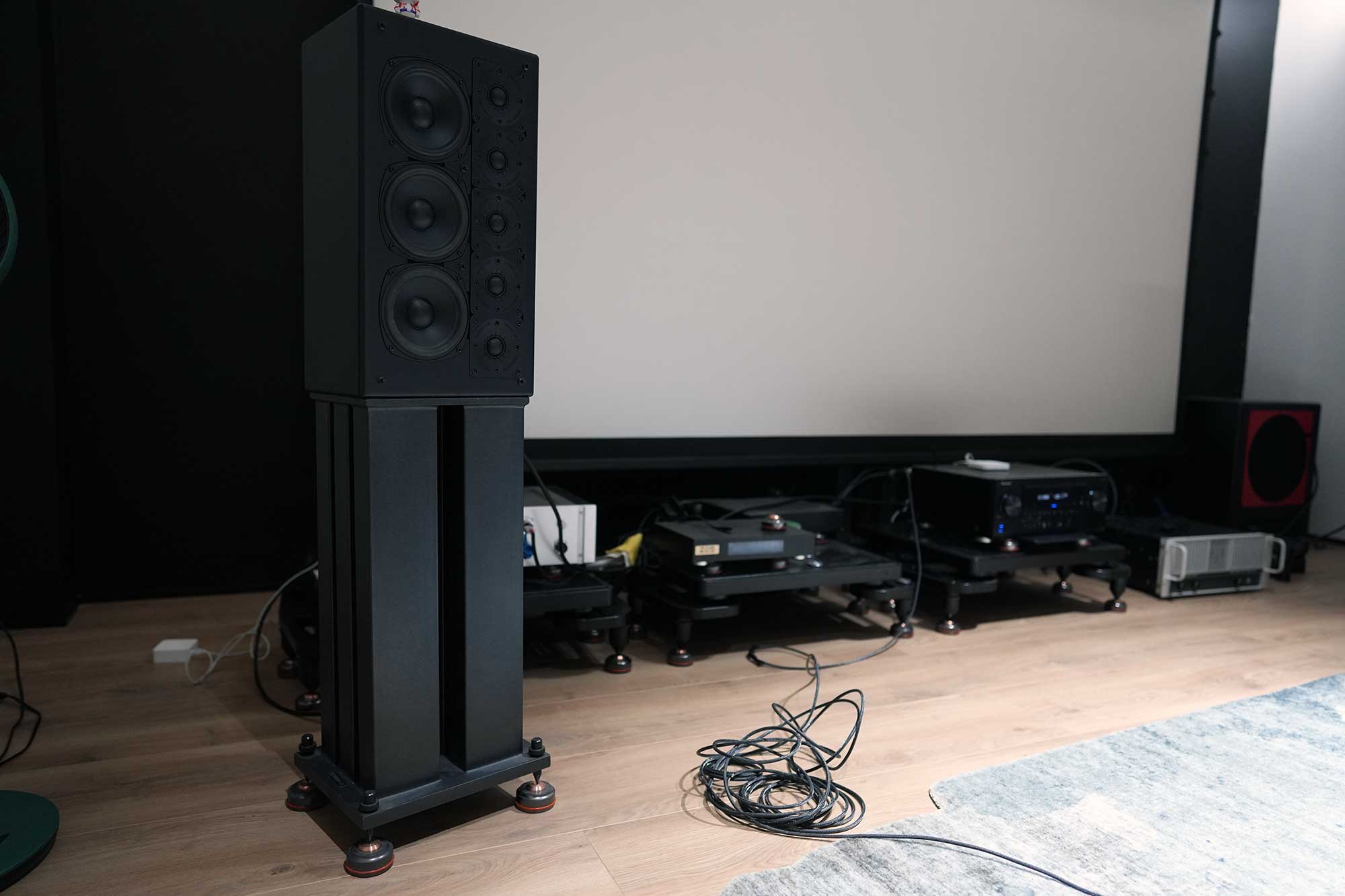 上面三张图,我们可以明显看出左右音箱和中置的不同,左右音箱离后墙有一米的距离。而中置是抵着后墙放于银幕后面,所以能看到他的低频部分和高频部分明显受到环境的影响。