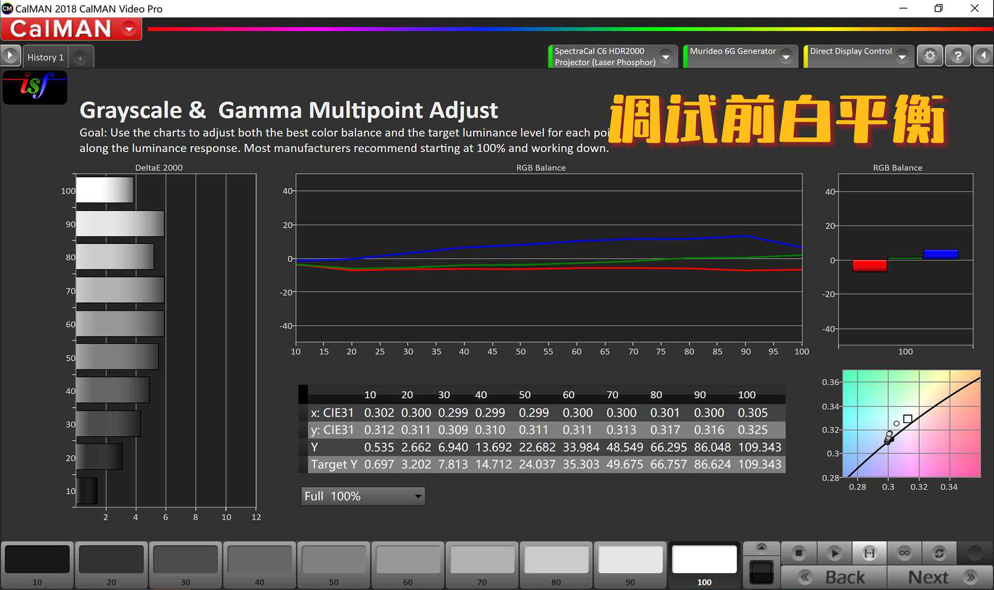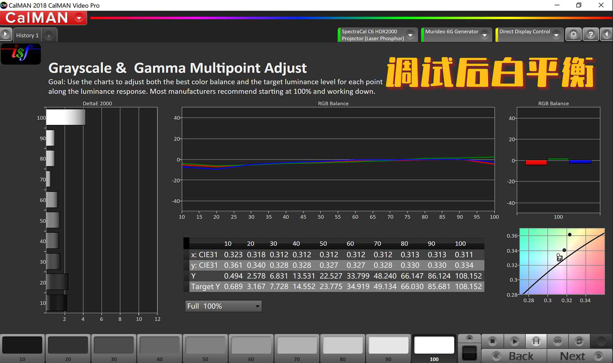 可以明显看出调试前RGB三色完全是不均横的,但亮度更高。而调试后亮度下降了10%左右。但好在100cd/㎡对于XW5000投射在160英寸1.4增益的透声幕上,确实也算是优秀的成绩。