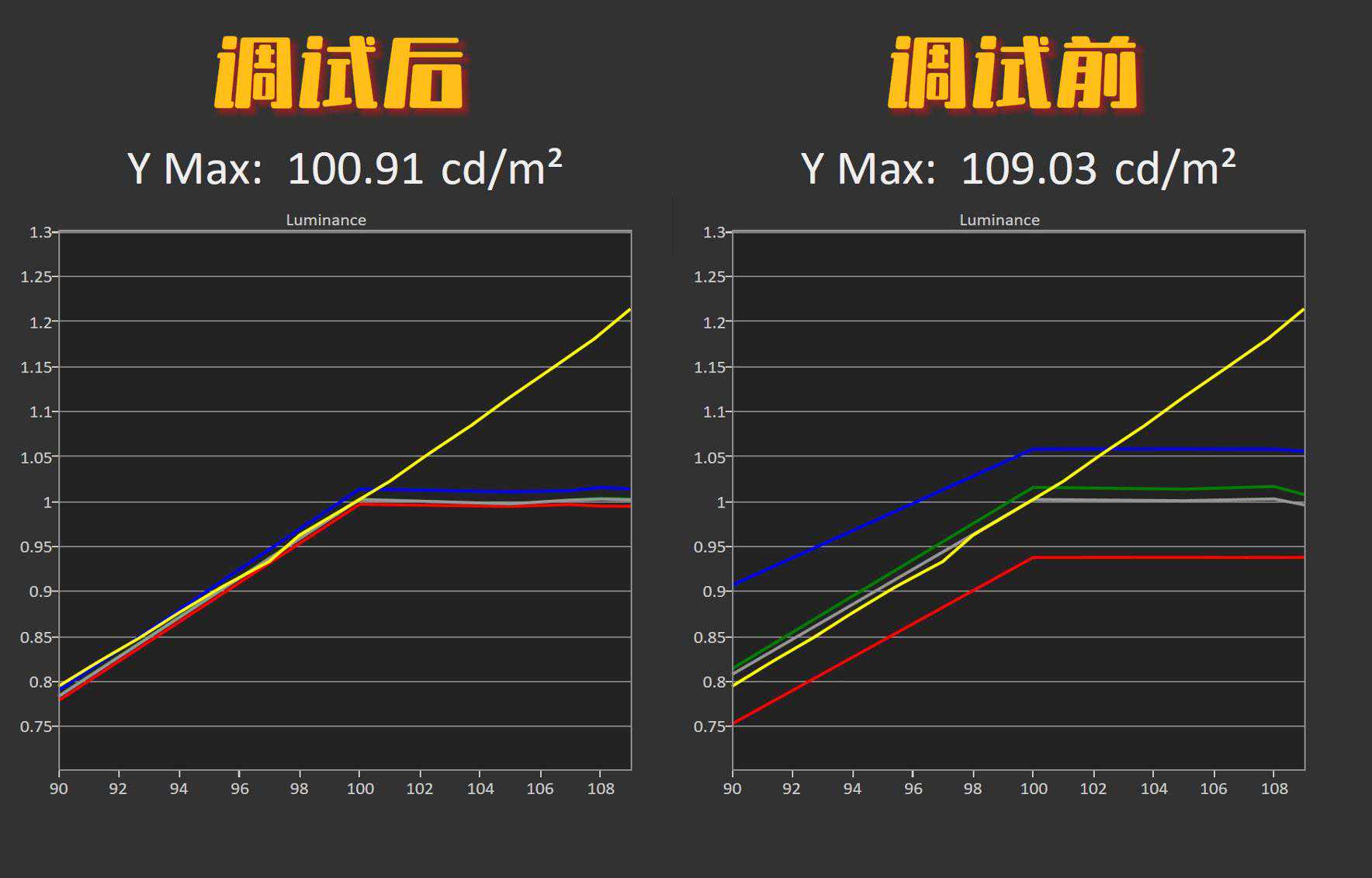 右边的调试前就是多出来的数据。而从右边调到左边比较标准的6500K,机器的亮度就必然会下降。