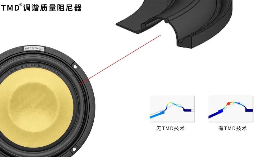 K2POWERM系列的高音、中音、中低音单元都采用了FOCAL专利技术TMD调谐质量阻尼器。这种解决方案在折环上仅包含2个管状环,它们的直径和位置都是经过仔细研究后确定的。它们构成了调谐质量阻尼器(TMD)并根据共振让环绕声的动态行为变得稳定,从而在不影响动态的情况下避免了椎体变形,该创新已经获得专利。