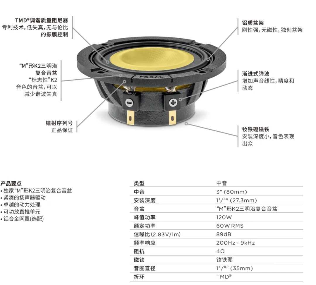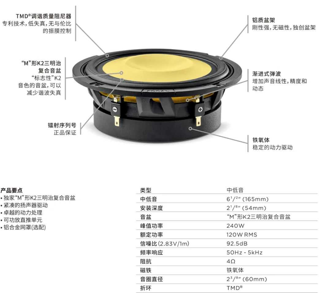 6.5KM中低音同样搭配了“M”形K2三明治复合音盆,采用TMD折环技术,渐进式弹波等设计,配合铝盆架和铁氧体,频率响应50Hz-5kHz,提供的功率和动力紧密结合,让您在行驶途中感受终极的聆听体验。